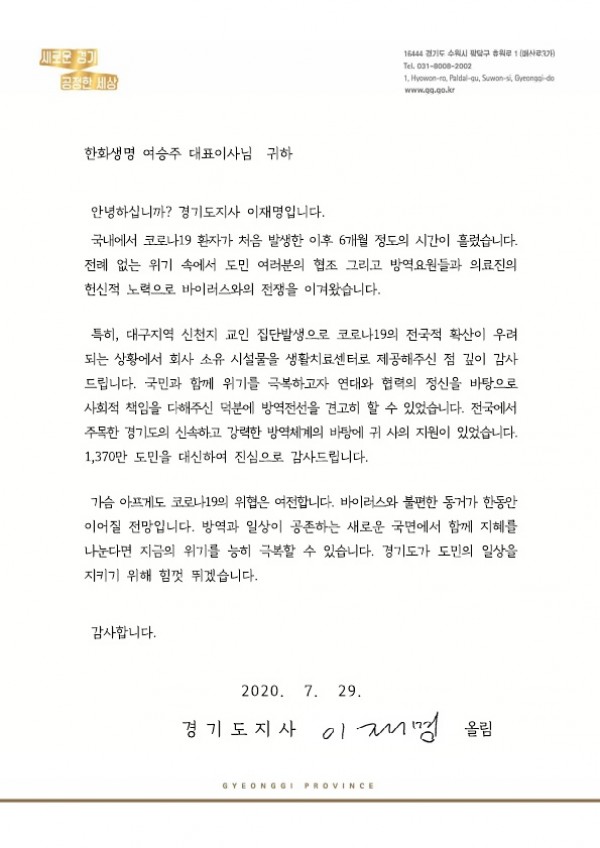 이재명 경기도지사는 지난 29일 회사 소유 시설을 생활치료센터와 임시생활시설로 제공한 한화생명 여승주 대표이사와 기아자동차 최준영 대표이사, SK텔레콤 박정호 사장에게 보낸 편지를 통해 “국민과 함께 위기를 극복하고자 사회적 책임을 다해주셨다”면서 “전국에서 주목한 경기도의 신속하고 강력한 방역체계의 바탕에는 귀사의 지원이 있었다”며 코로나19 경증환자 치료를 위해 경기도가 운영한 생활치료센터와 해외입국 도민 임시생활시설에 도움을 준 민간기업 및 의료기관 등 12곳에 감사 편지를 전달했다. 이와 함께 생…