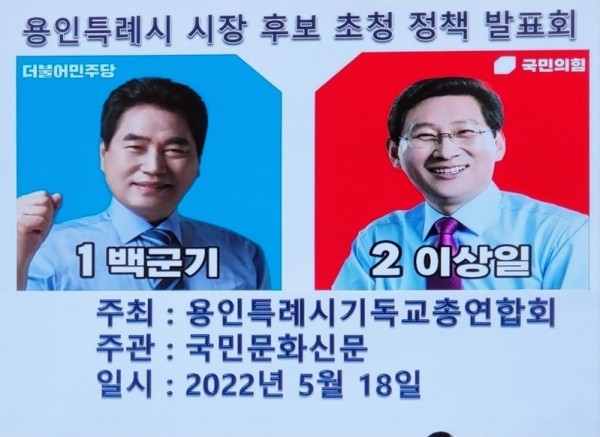▲ 용인특례시장 후보자 초청 정책발표회 더불어민주당 백군기 후보(좌), 국민의힘 이상일 후보(우) 용인특례시기독교총연합회(대표회장 김태진 목사, 이하 용기총)가 주최하고 국민문화신문(대표 유석윤 목사)이 주관한 ‘용인특례시장 선거 후보자 초청 정책발표회’가 지난 18일 루터대학교 강당에서 용인특례시민들이 참석한 가운데 진행되었다. 정책 발표회에는 이상일 후보(국민의힘)와 백군기 후보(더불…