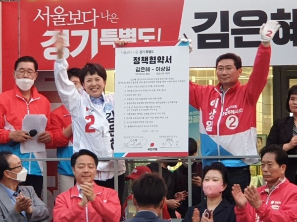 “용인특례시 발전을 위해 용인시민이 염원하는 10개 주요 사업을 경기도지사 후보와 용인특례시장 후보가 원팀으로 추진하겠다는 약속이다.”▲출정식에서 정책협약 추진을 약속하는 국민의힘 김은혜 경기도지사 후보(왼)와 이상일 용인특례시장 후보(오) 국민의힘 김은혜 경기도지사 후보와 이상일 용인특례시장 후보는 19일 용인중앙시장 일대에서 열린 지방선거 합동 출정식에서 국지도 57호선 단절구간 연결 등 용…
