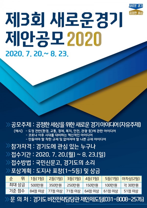 경기도가 더 공정하고 더 살기 좋은 경기도를 만들기 위해 전 국민을 대상으로 한 정책 아이디어 모집에 나선다.경기도는 8월 23일까지 제3회 ‘새로운 경기 제안공모 2020’을 진행한다고 21일 밝혔다. 올 들어 세 번째 열리는 이번 공모전은 특정 주제 없이, 도정 전 분야에 관한 다양한 아이디어를 제안하면 된다. 단, 제안은 일반적이고 원론적인 문제 제기나 단순한 의견이 아닌 창의적이고 구체적으로 실현가능한 아이디어여야 한…