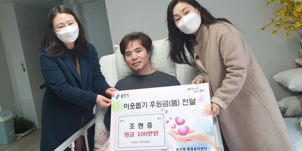 용인시 기흥구 보라동은 장애인이면서 기초생활수급자인 조모씨가 자신의 활동보조인을 통해 이웃돕기 성금 100만원을 기탁했다고 4일 밝혔다. 이 성금은 조씨가 어려운 형편에도 평소 알뜰히 절약하면서 모은 것이다. 조씨는 “전신에 장애가 있어 보조인 없인 거동조차 불편한 상태지만 …
