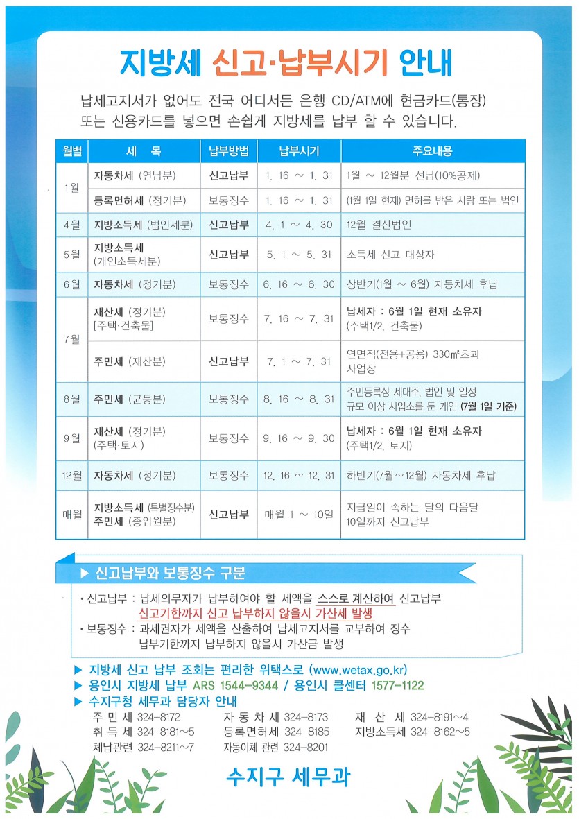 수지구, 지방세 납부 안내문 제작 구청․주민센터 비치 소비환경뉴스 2019-02-15 22:28 가 본문내용 확대/축소 본문 수지구, 지방세 납부 안내문 제작 구청․주민센터 비치 용인시 수지구는 주민들의 납세 편의를 위해 지방세 종류와 납부시기를 한눈에 알려주는 홍보물을 제작해 구청과 9개 동 주민센터에 비치했다고 15일 밝혔다. 지방세가 11개 세목으로 나눠져 있는데다 비슷한 세목명도 있고 납부기한도 달라 혼란을 겪는 경우가 많고 납세자들이 납부기한을 놓쳐 가산세(금)을 부담하는 않도록 하기 위해서다. 이 안내문은 A4 사이즈 규격으로 월별로 신고․납부해야하는 세목을 정리해 납부방법, 납부시기, 관련 주요내용, 담당부서 전화번호 등을 기재했다. 구는 앞선 1월 관내 전 세대주와 사업장에 안내문 13만건을 발송키도 했다. 수지구의 1월 자동차세 연납 신청 건수는 안내문 발송이후 4930건이 증가해 5만7261건에 이른다. 구 관계자는 “주민들이 원활하게 지방세를 납부할 수 있도록 다양한 방법으로 지속적으로 홍보에 나서겠다”고 말했다. 좋아요 0 싫어요 0 소비환경뉴스 기자의 다른기사 보기 목록 댓글목록 이전글 신갈동, 주민들과 동절기 대청소 나서 19.02.15 다음글 용인시 역삼동, 주민단체서 대보름맞이 합동 척사대회 19.02.15
