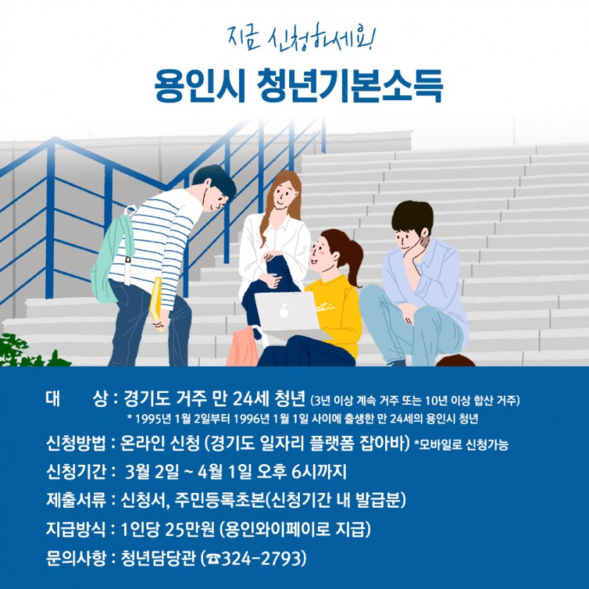 용인시, 2020년 1분기 청년기본소득 신청 접수 김경순 기자 2020-02-25 21:56 가 본문내용 확대/축소 본문 용인시, 2020년 1분기 청년기본소득 신청 접수 용인시는 3월2일부터 4월1일 오후 6시까지 올해 1분기 청년기본소득 지급 신청을 받는다. 대상은 경기도에 3년 이상 계속 거주하거나 거주한 일수의 합이 10년 이상인 1995년 1월2일부터 1996년1월1일 사이에 출생한 만24세의 용인시 청년이다. 신청은 경기도 일자리플랫폼 잡아봐(apply.jobaba.net)에서 회원가입을 한 뒤 온라인 또는 모바일로 하면 된다. 지난해 신청자 중 자동신청에 동의한 대상자는 별도 신청 없이도 혜택을 받을 수 있다. 신규 대상자와 자동신청에 동의하지 않은 사람들은 접수기간 내 신청해야 한다. 시는 대상자 확인 뒤 오는 4월20일부터 25만원을 지역화폐인 용인와이페이로 지급할 예정이다. 확정된 지급대상자엔 휴대폰 문자로 확정 메시지를 보내며, 신청 시 입력한 주소로 공카드를 배송한다. 수령한 카드는 고객센터나 모바일 앱에 등록해 바로 체크카드처럼 사용할 수 있다. 지급받은 지역화폐는 용인시내 전통시장 및 소상공인 업체 등에서 현금처럼 자유롭게 사용할 수 있다. 백화점, 대형마트, 기업형슈퍼마켓(SSM), 유흥업소 등에선 사용할 수 없다. 좋아요 0 싫어요 0 김경순 기자 기자의 다른기사 보기 목록 댓글목록 이전글 경기동부보훈지청, 3·1절 101주년 계기 생존 애국지사와 민족대표 33인 유족 위문 20.02.25 다음글 사립유치원 감사 관련 한국일보(2020.2.24.) 기사에 대한 해명 20.02.25