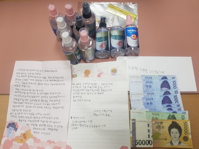 앞선 25일엔 지적장애인 A모씨(30세)가 상현1동 행정복지센터를 찾아와 성금 6만7000원과 직접 만든 손소독제 10개를 손편지와 함께 전달했다.