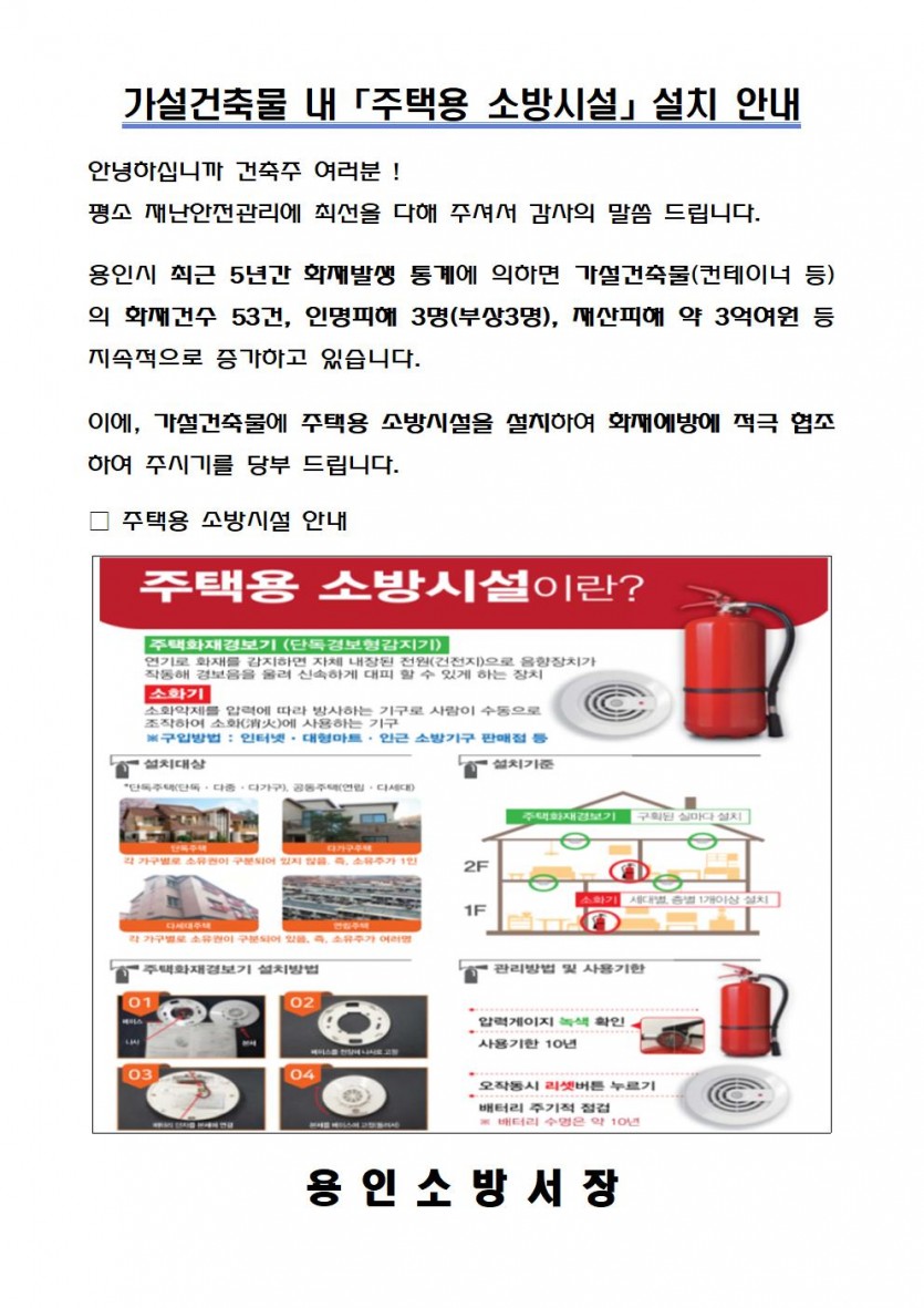 용인소방서, 가설건축물 주택용 소방시설 설치 안내