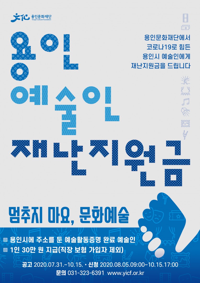 ‘코로나19 극복을 위한’<용인 예술인 재난지원금> 연장 - 9월 4일에서 10월 15일로 신청 기간 연장 - 용인시에 주소를 둔 예술활동증명 완료 예술인에게 30만 원 지급 - 코로나19 격상으로 인한 피해 예술인 지원 김경순 기자 2020-08-31 21:15 가 본문내용 확대/축소 본문 ‘코로나19 극복을 위한’<용인 예술인 재난지원금> 연장 (재)용인문화재단(이사장 백군기)은 코로나19 사태가 심각해짐에 따라 경제적 어려움을 겪고 있는 용인 예술인들에게 지원금을 지급하는 <용인 예술인 재난지원금>(이하 <재난지원금>) 사업의 신청 기간을 기존 9월 4일에서 10월 15일로 연장한다. <재난지원금>은 용인시에 주소를 둔 예술활동증명(한국예술인복지재단)을 완료한 용인 예술인에게 30만 원(예산 소진 시까지)을 현금으로 균등 지급하는 지원사업으로 지난 7월 31일 공고를 시작으로 9월 4일(공고일 기준 총 5주 간)까지 신청을 마감할 예정이었다. 그러나 코로나19 사태가 장기화 국면으로 접어들면서 예술인들의 피해가 심화되고 있으며, 본 사업의 자격 요건인 예술인활동증명 확인서 발급에 대한 전국적인 수요 급증에 따른 처리 기간 지연 등의 문제가 제기되었다. 이에 따라 용인문화재단은 보다 많은 관내 예술인에게 혜택을 제공하고자 신청 기간을 10월 15일(공고일 기준 총 12주 간)로 연장하기로 결정했다. 자격 요건은 기존과 동일하며, 요건을 갖춘 예술인은 신청 기간에 맞춰 지원신청서와 개인정보 수집·이용 동의서(용인문화재단 홈페이지 서식 다운로드), 주민등록 초본·건강보험자격득실확인서(공고일 이후 발급분), 유효기간(메일 접수일 기준) 내에 있는 예술활동증명 확인서, 통장 및 신분증 사본 등 필요 서류를 온라인(yicf2020@naver.com)으로 제출하면 된다. 다만 생계가 어려운 예술인의 ‘지속적인 문화예술 활동 장려’라는 본 사업의 취지를 최대한 살리기 위해 직장보험 가입자와 국·공립 문화예술기관 소속 예술인은 대상에서 제외된다. 단, 직장보험 가입자 중 문화예술을 본업으로 하는 전문예술단체 소속 가입자는 지원이 가능하다. 재단은 적격 여부 검토 후 지원 대상자 선정, 기존 신청자는 9월 중, 연장 기간 신청자는 10~11월 중 신청인 통장으로 순차적(접수순)으로 지급할 계획이다. 기타 자세한 내용은 용인문화재단 홈페이지(www.yicf.or.kr) 공지사항에서 확인할 수 있다. 문의 031-323-6391 좋아요 0 싫어요 0 김경순 기자 기자의 다른기사 보기 목록 댓글목록 이전글 유림동, 생활밀착형 서비스 제공‘행복마을관리소’본격 운영 20.08.31 다음글 동부지역 여성복지회관 건립 타당성 조사 의뢰 20.08.31
