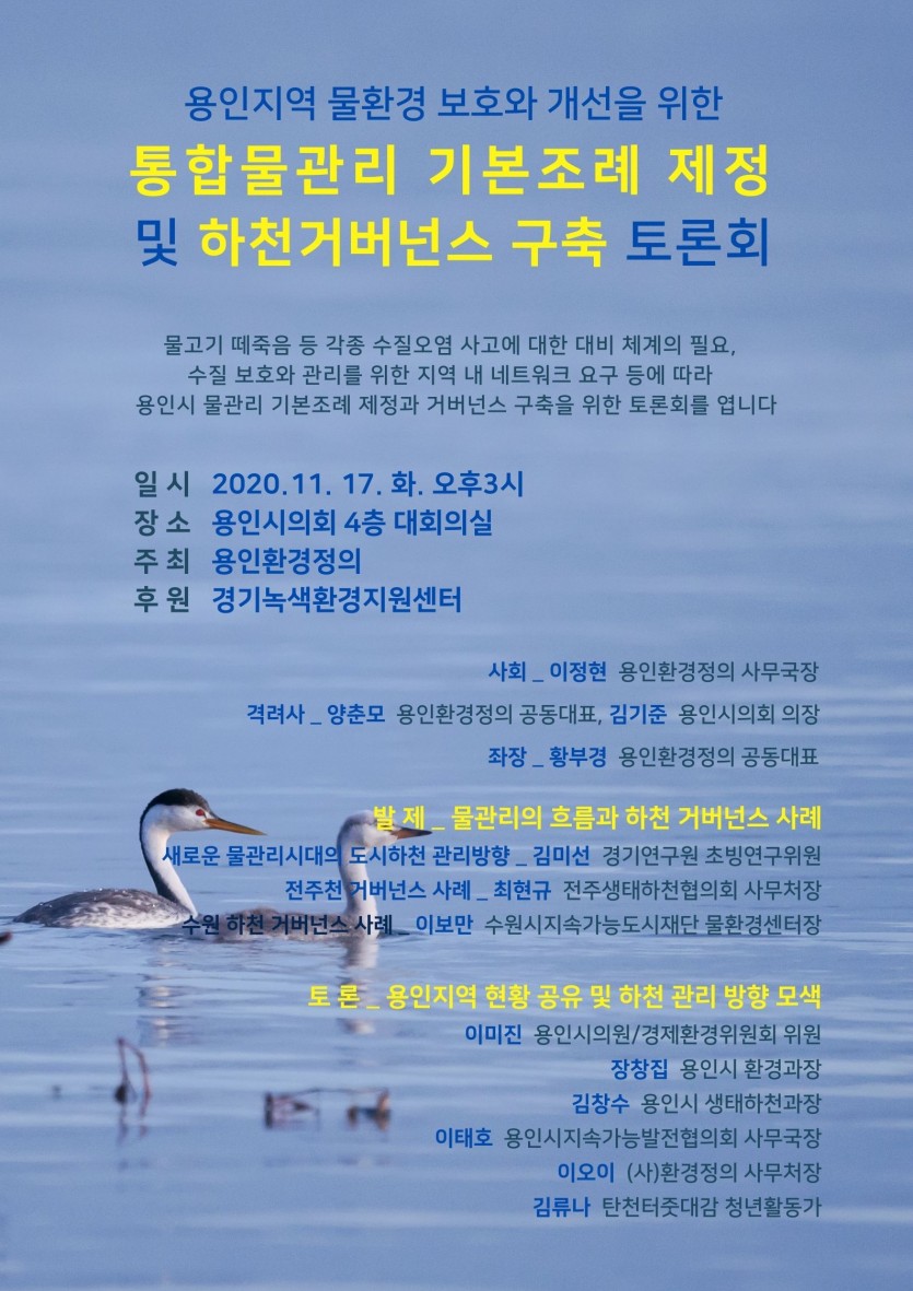 용인지역 물환경 보호 및 개선을 위한 통합물관리 기본조례 제정과 하천 거버넌스 구축 토론회 김경순 기자 2020-11-12 18:42 가 본문내용 확대/축소 본문 용인지역 물환경 보호 및 개선을 위한 물고기 떼죽음 등 각종 수질오염 사고에 대한 대비체계의 필요성 대두, 수질 보호와 관리를 위한 지역 내 네트워크 요구 등에 따라 용인시 통합물관리 기본조례 제정 및 하천 분야 거버넌스 구축을 위한 토론회를 아래와 같이 개최하니 취재 바랍니다. ---------------------------------- 아 래 ----------------------------------- ○ 일시 : 2020. 11. 17. 화. 오후3시~5시 30분 ○ 장소 : 용인시의회 4층 대회의실 ○ 내용 : 물관리의 흐름과 하천 거버넌스 사례 용인지역 현황 공유 및 하천 관리 방향 모색 ○ 주최 : 용인환경정의 [붙임] 1. 토론회 개요 2. 토론회 웹자보 [붙임] 1. 토론회 개요 ■ 개요 -. 제목 : 용인 통합물관리 기본조례 제정과 하천 거버넌스 구축을 위한 토론회 -. 일시 : 2020년 11월 17일 화. 15시~17시 30분 -. 장소 : 용인시의회 4층 대회의실 -. 목적 : 통합물관리 기본조례 제정과 하천거버넌스 구축 준비 및 과제 도출 -. 대상 : 용인시, 용인시의회, 전문가, 시민사회단체, 시민 등 -. 주최 : 용인환경정의 -. 후원 : 경기녹색환경지원센터 ■ 추진 배경 및 목적 (1) 배경 ◦ 최근 용인 관내 물고기 집단폐사 및 수질오염 사고 수차례 발생 ◦ 사고 시 대응체계가 미비한 상황에서 지역대비체계 필요성 대두 ◦ 수질 보호와 관리를 위한 지역 내 네트워크 구성 시급 (2) 목적 ◦ (단기) 수질오염 세부 대응 매뉴얼 점검 및 지역 네트워크 구축 ◦ (장기) 용인시 통합물관리 기본조례 제정 및 민관거버넌스 구축 ■ 토론회 프로그램 시 간 내 용 사회 이정현 용인환경정의 사무국장 15:00~15:10 개회 여는말 _ 양춘모 용인환경정의 공동대표 격려사 _ 김기준 용인시의회 의장 15:10~15:30 발제1 새로운 물관리시대의 도시하천 관리방향 _김미선 경기연구원 초빙연구위원 15:30~15:50 발제2 전주천 거버넌스 사례 _최현규 전주생태하천협의회 사무처장 15:50~16:10 발제3 수원 하천 거버넌스 사례 _이보만 수원시지속가능도시재단 물환경센터장 토론회 좌장 황부경 용인환경정의 공동대표 16:10~16:50 지정토론 이미진 용인시의원/경제환경위원회 위원 장창집 용인시 환경과장 김창수 용인시 생태하천과장 이태호 용인시지속가능발전협의회 사무국장 이오이 (사)환경정의 사무처장 김류나 탄천터줏대감 청년활동가 16:50~17:30 전체토론 용인 하천의 관리를 위한 과제 및 방안 등 토론 ■ 기대효과와 성과 활용방안 (1) 기대효과 ◦ 용인지역 내 수질오염 대응 매뉴얼 전문가 검토로 완성도 증가 ◦ 용인지역 내 물환경 관련 일반 시민의 관심 증대 ◦ 지역에서 활동하는 기관·단체의 네트워크 구성으로 물환경 문제 공동 대응 ◦ 민관학 협력으로 수질오염 발생 시 조속한 대처 가능 (2) 활용방안 ◦ 용인시 통합물관리 기본조례 제정 촉구 ◦ 조례에 기반을 둔 하천 거버넌스 구축 좋아요 0 싫어요 0 김경순 기자 기자의 다른기사 보기 목록 댓글목록 이전글 용인백현고, 학교를 허물고 마을로 확장되는 온라인 과학축제 열어 20.11.14 다음글 용인교육지원청, 교육현장 상호존중문화 정착을 위한 3대 행(行)·실(實) 선정 20.11.12