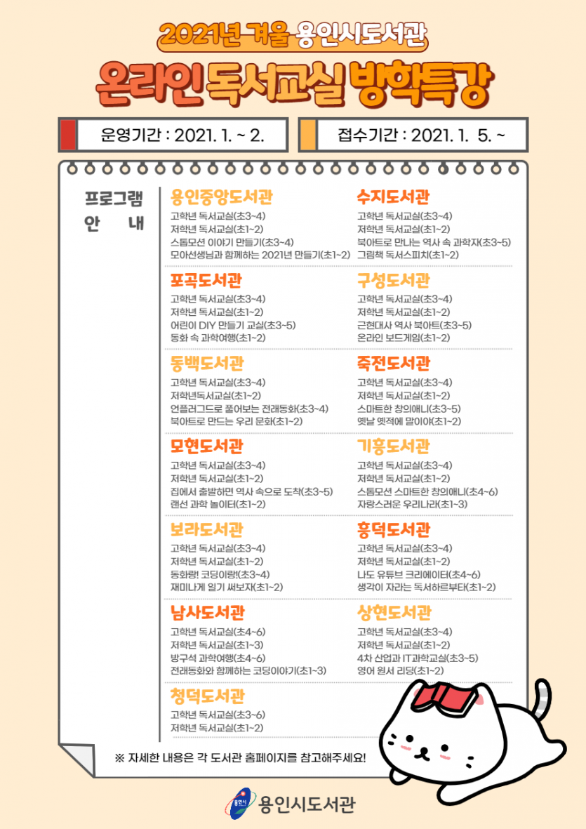 겨울방학 맞아 온라인 독서교실 및 방학특강 운영 - 1월 18일부터 관내 13개 도서관서 50개 프로그램 진행 - 김경순 기자 2020-12-29 08:17 가 본문내용 확대/축소 본문 겨울방학 맞아 온라인 독서교실 및 방학특강 운영 용인시도서관이 1월 5일부터 겨울방학을 맞은 어린이들을 위한 ‘온라인 독서교실 및 방학특강’ 참여자를 선착순으로 모집한다고 28일 밝혔다. 시 도서관은 코로나19로 인해 외부활동이 제한된 상황에서 방학을 맞은 어린이들을 위해 온라인으로 집에서 참여할 수 있는 독서교실 및 방학특강을 마련했다. 1월 18일부터 2월 5일까지 용인중앙도서관, 수지도서관, 기흥도서관 등 13개 도서관에서 진행하며 각 도서관 마다 독서교실을 비롯해 자랑스러운 우리나라, 동화 속 과학여행, 어린이 DIY 만들기 교실, 전래동화와 함께하는 코딩이야기 등 50가지의 다채로운 프로그램을 운영한다. 신청은 1인 1강좌 접수를 원칙으로 시 도서관 홈페이지를 통해 하면 된다. 시 도서관 관계자는 “코로나19로 밖에서 뛰어놀 수 없는 아이들을 위해 비대면 프로그램은 마련했다”며 “어린이들이 안전한 환경 속에서 즐거운 방학을 보내는데 도움이 되길 바란다”고 말했다. 자세한 내용은 시 도서관 홈페이지(https://lib.yongin.go.kr)를 통해 확인하면 된다. 좋아요 0 싫어요 0 김경순 기자 기자의 다른기사 보기 목록 댓글목록 이전글 ‘2020 국민참여 청렴콘텐츠 공모전’우수상 수상 20.12.29 다음글 노후한 용인공영버스터미널 재건축 본격화 20.12.29