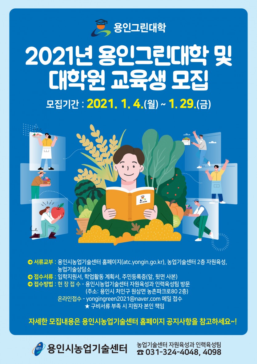 농업인재 육성 ‘용인그린대학 15기 및 대학원’ 교육생 모집 용인시, 그린농업과·신규농업과·수목관리과정 등 3개 과정 128명…1월 29일까지 신청 - 김경순 기자 2021-01-07 05:22 가 본문내용 확대/축소 본문 농업인재 육성 ‘용인그린대학 15기 및 대학원’ 교육생 모집 용인시는 농업 인재 육성과 귀농 희망자의 정착을 돕는 용인그린대학 및 대학원의 교육생 128명을 1월 29일까지 모집한다. 도시농업‧친환경농업 관련한 그린농업과 49명, 귀농‧귀촌 희망자를 교육하는 신규농업과 49명, 대학원은 수목관리과정 30명으로 총 128명을 서류심사와 면접을 통해 교육생을 선발한다. 모집 대상은 귀농‧귀촌을 원하거나 도시농업에 관심이 있는 용인시민 누구나 신청할 수 있으며, 대학원은 그린대학 졸업생만 지원할 수 있다. 교육은 오는 3월부터 10월까지 농업기술센터 등에서 진행되며, 주1회 4시간씩 총 108시간을 이수해야 한다. 시에서 수강료와 교재비는 지원하나 견학비 등 일부는 교육생이 부담해야 한다. 교육 희망자는 시 홈페이지나 농업기술센터 홈페이지 모집 요강을 참고해 전자우편(yongingreen2021@naver.com)으로 제출하거나 센터에 직접 방문해 서류를 제출하면 된다. 자세한 내용은 농업기술센터 자원육성과(031-324-4048)로 문의하면 된다. 좋아요 0 싫어요 0 김경순 기자 기자의 다른기사 보기 목록 댓글목록 이전글 수지구보건소, 아토피천식예방관리 우수기관 선정 21.01.07 다음글 김정원 수지구청장, 코로나19 방역 현장 점검 21.01.07