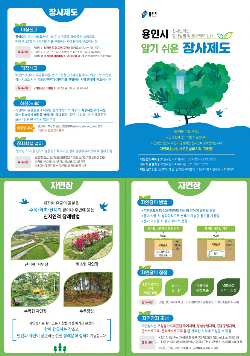 처인구, 자연친화 장사(葬事) 제도 안내 홍보물 제작・배포 김경순 기자 2021-01-19 20:44 가 본문내용 확대/축소 본문 처인구, 자연친화 장사(葬事) 제도 안내 홍보물 제작・배포 용인시 처인구는 19일 자연 친화적인 장사제도를 안내하는 홍보물을 제작해 11개 읍・면・동 행정복지센터와 노인복지관 등에 배부했다고 밝혔다. 처인구 원삼면 일대 용인 반도체클러스터 일반산업단지 조성에 따라 1,100기 이상의 분묘의 이장이 예상되는 등 시민들에게 올바른 이장 절차와 자연 친화적인 장례 제도 등을 안내하기 위해서다. 홍보물엔 자연장의 개념과 종류, 방법과 장점 등의 내용과 ‘장사 등의 관한 법률’ 위반으로 인한 불이익을 방지할 수 있도록 매장・개장 신고, 장시 시설 설치와 관련한 유의사항을 담았다. 자연장을 이용할 경우 개인 사유지에 자연장지 신고를 하거나 관내 공설 자연장지인 용인 평온의 숲 또는 사설 자연장지 등을 이용하면 된다. 용인 평온의 숲에선 관내 주소지를 둔 시민에 한해 화장 시 개인은 10만원, 개장 유골은 6만원 등 타 화장시설에 비해 저렴한 비용으로 이용할 수 있도록 했다. 구 관계자는 “화장 후 봉안당에 유골을 안치하거나 친환경 자연장지를 조성하는 장례문화로 변하고 있는 추세”라며 “자연 친화적인 장례문화가 잘 정착할 수 있도록 지속적으로 홍보에 나설 것”이라고 말했다. 좋아요 0 싫어요 0 김경순 기자 기자의 다른기사 보기 목록 댓글목록 이전글 내달 10일까지 녹색건축물 조성 지원 신청 접수 21.01.19 다음글 용인시, 곳곳에서 어려운 이웃 돕기 위한 성금품 기탁 이어져 21.01.19