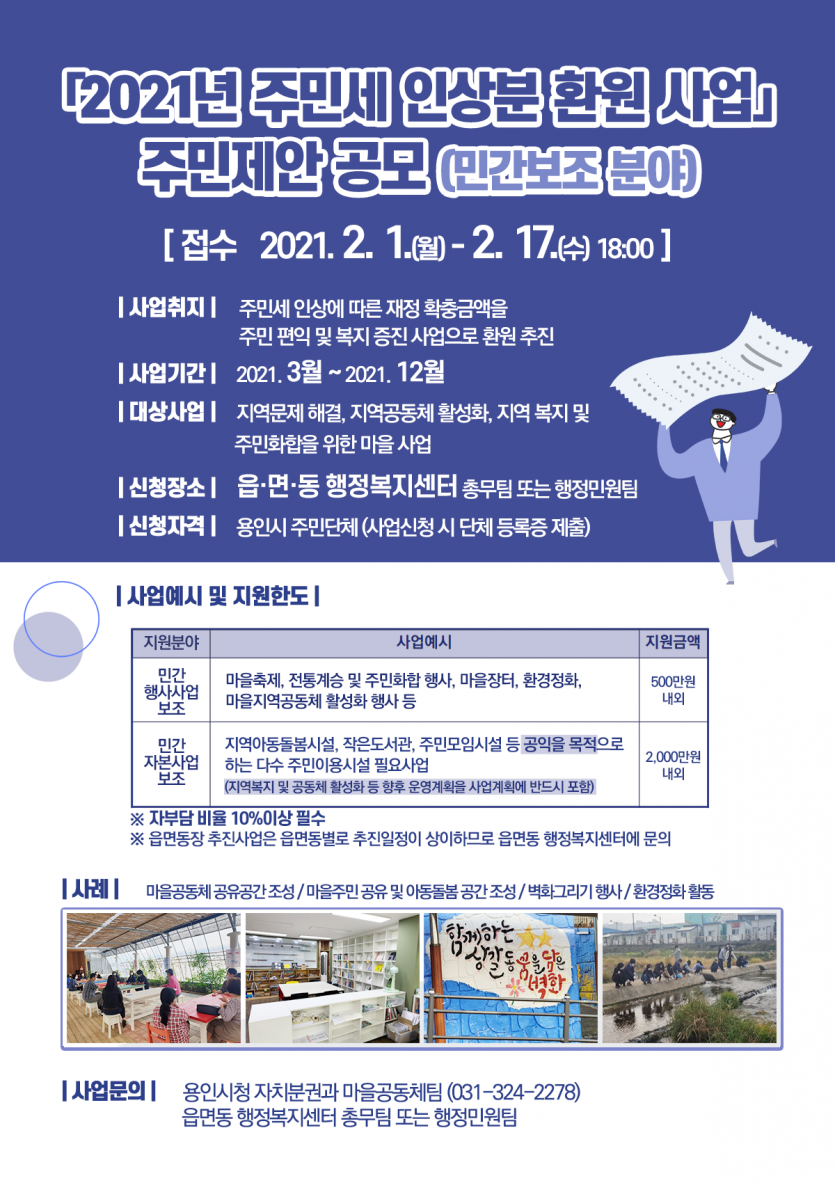 ‘2021년 주민세 인상분 환원 사업’ 진행 - 주민 복지 및 공동체 활성화위해 총 14억5천만 원 지원 - 김경순 기자 2021-02-02 18:18 가 본문내용 확대/축소 본문 ‘2021년 주민세 인상분 환원 사업’ 진행 용인시가 늘어난 세수를 주민들에게 돌려주는 ‘2021년 주민세 인상분 환원 사업’을 진행한다고 1일 밝혔다. 주민세 인상분 환원 사업은 주민세 인상으로 확충된 재정을 주민들에게 돌려주기 위해 지난해 처음 도입했다. 주민 불편 해소를 위해 각 읍면동에서 추진하는 사업과 지역 복지 및 지역공동체 활성화를 위해 주민들이 직접 제안하는 사업에서 선정해 지원하는 방식이다. 이에 지난해 ▲굴다리 아트타일 설치 ▲하천 수질개선 및 환경정화 활동 ▲마을 쉼터공원 조성 및 정비 ▲주민 커뮤니티 공간 조성 ▲마을 꽃길 조성 등 총 71개 사업에 13억8천만 원을 지원해 지역문제를 해결하고 주민 화합을 도모했다. 올해는 읍면동 추진사업에 12억원, 주민 제안 사업에 2억5천만원 등 총 14억5천만원을 지원한다. 읍면동 추진사업은 각 읍면동에서 주민 의견 수렴 후 자체 실정에 따라 진행할 예정이다. 주민 제안 사업은 이날부터 17일까지 공모를 진행한 뒤 다음달 중 사업선정심사위원회의 심의를 거쳐 선정할 방침이다. 공모는 마을 축제, 환경정화 등 주민공동체 활성화를 위한‘민간행사사업’과 아동돌봄시설, 작은도서관 등 주민이용시설 확충을 위한‘민간자본사업’으로 나눠 진행하고 주민단체 또는 10인 이상 주민모임이면 참여할 수 있다. 시 관계자는 “늘어난 세수를 주민들에게 돌려드리기 위해 지난해 처음 시작한 주민세 인상분 환원사업에 대한 주민의 만족도가 상당히 높다”면서 “공동체 활성화나 주민복지에 도움이 될만한 사업들을 적극적으로 제안해 주길 바란다”고 말했다. 자세한 내용은 시 홈페이지(www. yongin.go.kr)에서 확인할 수 있고 문의는 시 자치분권과(031-324-2278)나 각 읍면동 총무팀 또는 행정민원팀으로 하면 된다. 좋아요 0 싫어요 0 김경순 기자 기자의 다른기사 보기 목록 댓글목록 이전글 아트 감수성 UP 프로젝트‘책 속 예술여행’진행 21.02.02 다음글 설 연휴 종합상황실 운영 시민 불편에 즉각 대응 21.02.02
