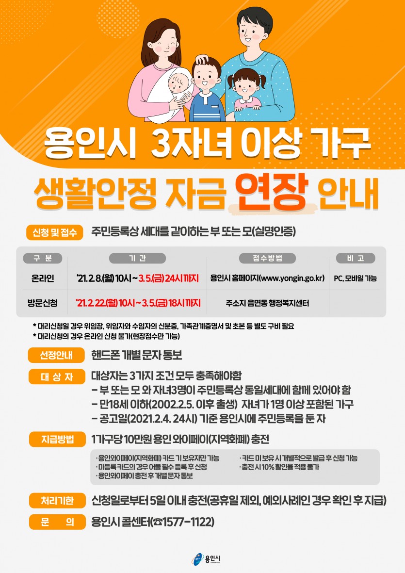 3자녀 이상 생활안정자금 3월5일까지 연장 접수 용인시, 공고일 기준 시에 주민등록 둔 3자녀 가구에 10만원 지급 - 김경순 기자 2021-02-26 00:31 가 본문내용 확대/축소 본문 3자녀 이상 생활안정자금 3월5일까지 연장 접수 용인시는 3자녀 이상 가구에 지급하는 생활안정자금 지원 접수를 3월 5일까지 1주일 연장키로 했다고 밝혔다. 용인와이페이 카드 신규 발급 등으로 신청 기한을 놓친 가구 등 대상자들이 빠짐없이 혜택을 받을 수 있도록 하려는 것이다. 시에 따르면 25일 기준 대상 가구의 75%인 9500여가구가 신청을 완료했다. 생활안정자금은 가구당 10만원을 용인와이페이로 지급한다. 대상은 공고일(2021년2월4일) 기준 시에 주민등록을 두고 부모와 세대를 같이하는 3자녀 이상 가구 중 18세(2002년 2월 5일 이후 출생)이하 자녀가 1명 이상인 가구다. 온라인으로 신청을 원하는 사람은 시 홈페이지 ‘용인시 경제지원 대책’코너에서 5일 24시까지 신청하면 된다. 현장 접수는 대상 가구의 부모나 보호자가 5일 18시까지 주소지 관할 읍・면・동 행정복지센터를 방문하면 된다. 시 관계자는 “코로나19로 어려움을 겪고 있는 다자녀 가구에 작게나마 도움을 주고자 생활안정자금을 지급키로 한 만큼 대상 가구는 기간 내 신청해 혜택을 받으시길 바란다”고 말했다. 좋아요 0 싫어요 0 김경순 기자 기자의 다른기사 보기 목록 댓글목록 이전글 옆으로 누워야 허리 덜 아프면, 척추관 협착증 의심 21.02.26 다음글 처인구, 경안천・완장천 내 불법경작 집중 단속 21.02.26