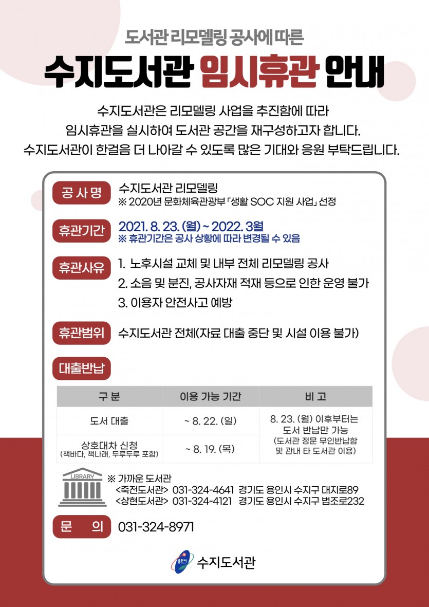 용인시, 오는 8월 수지도서관 리모델링 공사 착수 국비 10억 포함 총 25억 원 투입해 개방형 복합문화공간으로 탈바꿈 - 김경순 기자 2021-06-01 03:20 가 본문내용 확대/축소 본문 용인시, 오는 8월 수지도서관 리모델링 공사 착수용인시, 오는 8월 수지도서관 리모델링 공사 착수 용인시가 오는 8월부터 총 25억 원을 투입해 수지도서관 리모델링 공사에 착수한다. 수지도서관은 지난 2004년 지하 1층 지상 3층 연면적 5천59㎡ 규모로 개관했다. 이번 리모델링 공사는 수지도서관의 노후 시설을 개선하고 시민에게 보다 나은 서비스를 제공하기 위해 오는 8월 23일부터 내년 3월까지 내부 전체를 진행한다. 예산은 ‘2020년 문화체육관광부 생활SOC 지원사업’에서 확보한 국비 10억 원에 시비 15억 원을 더해 마련했다. 시는 이번 리모델링 공사를 통해 냉·난방시스템 등 기본적인 시설물 교체는 물론 열람 공간 확대, 소모임실 마련, 북카페 설치 등으로 수지도서관을 소통과 휴식이 공존하는 개방형 복합문화공간으로 변화시킨다는 방침이다. 아울러 올해 초 전문가 컨설팅과 시민 설문조사를 진행해 수렴한 의견을 토대로 자료실 및 노트북 이용 좌석 확대, 4차 산업 미래체험공간 설치 등도 진행할 계획이다. 리모델링 공사 기간에는 시설 전체를 임시 휴관한다. 다만, 관내 다른 공공도서관에서 대출한 도서를 자유롭게 반납할 수 있도록 입구에 설치된 무인반납함은 상시 운영한다. 지역 서점과 연계해 진행하고 있는 동네서점 바로대출서비스도 지속 운영한다. 시 관계자는 “오는 7월 추가경정예산에서 7억 원의 예산을 추가 확보할 계획이다. 노후 시설과 불편 사항을 개선해 시민들에게 최상의 서비스를 제공하겠다”며 “수지도서관을 우리의 삶과 함께하는 소통과 문화의 공간, 최신 트렌드가 반영된 새로운 공간으로 만들겠다”고 말했다. 한편 수지도서관은 약 28만 권의 장서를 보유하고 있으며, 지난 3월 말 기준 일평균 이용자 2천912명·대출권수 3천149권으로 용인시민들이 가장 많이 이용하는 문화공간으로 자리매김하고 있다. 좋아요 0 싫어요 0 김경순 기자 기자의 다른기사 보기 목록 댓글목록 이전글 용인시, 비대면‘꿈이룸 안전체험교실’운영 21.06.01 다음글 만 60~74세 코로나19 백신 접종 예약 마감 임박 21.06.01