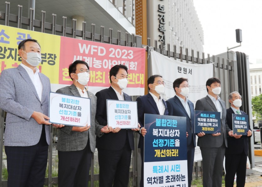 용인시의회 김기준 의장, 사회복지급여 기본재산액 고시 개정 촉구 보건복지부 기본재산액 고시 개정촉구 성명서 발표 및 1인 시위 전개 - 김경순 기자 2021-07-15 00:00 가 본문내용 확대/축소 본문 용인시의회 김기준 의장, 사회복지급여 기본재산액 고시 개정 촉구 용인시의회 김기준 의장은 14일 세종특별자치시 보건복지부 앞에서 특례시 시장 및 의장들과 함께 사회복지 특례권한 확보를 위한 기본재산액 고시 개정을 촉구하는 성명서 발표 및 1인 시위를 진행했다. 이 자리에는 김기준 의장을 비롯해 백군기 용인시장, 허성무 창원시장, 염태영 수원시장, 조석환 수원시의회 의장, 이치우 창원시의회 의장 등 특례시 관계자들이 함께했다. 그동안 용인을 비롯한 4개 특례시는 청와대, 국무총리, 보건복지부 등을 방문해 특례시의 복지급여 산정 시 대도시 기준을 적용해 줄 것을 여러 차례 건의했지만, 소관부처의 소극적인 자세로 진전이 없어 450만 특례시 시민을 대표해 특례시 시장과 의장들이 행동에 나선 것이다. 이날 특례시 시장과 시의장들은 1인 시위에 앞서 기본재산액 고시 개정 촉구 성명서를 발표하고, “특례시 시민들을 역차별하는 ‘사회복지급여 기본재산액 구간 고시’ 개정에 즉각 나서라”고 요구했다. 이들은 “특례시가 되지만 복지급여 기준은 20년 전 기준인 ‘중소도시’라며, 인구가 100만이 넘어도 복지급여 기준은 중소도시 기준을 적용받아 지속적인 역차별을 받고 있다”고 지적했다. 릴레이 1인 시위에는 백군기 용인시장과 김기준 용인시의회 의장을 비롯한 4개 특례시 시장과 의장 등이 참여했으며, 19일부터는 장소를 바꿔 청와대 분수대 앞에서 특례시장, 의장, 시민들이 1일씩 교대로 이어갈 예정이다. 한편, 이날 참석한 시장 및 의장들은 양성일 보건복지부 1차관을 면담하고, ‘기본재산액 고시 개정 촉구 성명서’와 ‘고시 개정 촉구 건의문’을 전달했다. 김기준 의장은 “알맹이 없는 특례시 출범은 시민들을 기만하는 결과가 될 수 있다”면서 “향후 사회복지뿐 아니라 자치 권한, 재정 등 특례시 권한 확보 요청이 받아들여지지 않는다면 청와대, 중앙정부 등에서 시위를 이어나갈 것이며 삭발 투쟁도 불사하겠다”고 말했다. 좋아요 0 싫어요 0 김경순 기자 기자의 다른기사 보기 목록 댓글목록 이전글 용인시의회 김기준 의장, 사회복지급여 기본재산액 고시 개정 촉구 21.07.15 다음글 상현1동, 심곡초 앞 100M 구간에 LED 벽화 설치 21.07.14