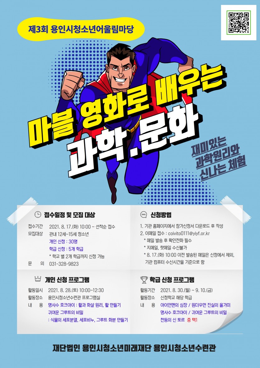 제3회 용인시청소년어울림마당‘마블영화로 배우는 과학・문화’ - 영화 속 과학의 원리, 즐겁게 배워보자! - 김경순 기자 2021-08-11 23:09 가 본문내용 확대/축소 본문 제3회 용인시청소년어울림마당‘마블영화로 배우는 과학・문화’ (재)용인시청소년미래재단 용인시청소년수련관에서는 제3회 용인시청소년어울림마당‘마블 영화로 배우는 과학・문화’를 오는 28일부터 다음달 10일까지 실시한다. 2021년 용인시청소년어울림마당은 여성가족부・경기도가 주최하고 용인시청소년미래재단 용인시청소년수련관에서 주관하여, 연간 총5회 운영된다. 세 번째로 실시되는 이번 행사는 과학에 대한 어려움을 느끼고 있는 청소년에게 친근한 마블 영화를 활용하여 과학 원리 및 관련 체험을 할 수 있다. 프로그램은 아이언맨의 심장, 원더우먼 진실의 올가미, 명사수 호크아이, 귀여운 그루투의 비밀, 천둥의 신 토르 과학원리 및 관련 체험으로 구성되어 있다. 참가 대상은 관내 12세~15세 청소년으로 개인 및 학급 단위로 신청 할 수 있으며 오는 17일 오전 10시부터 선착순 메일 접수로, 자세한 내용은 기관 홈페이지(https://bit.ly/2VHD7rW)를 참고하면 된다. 용인시청소년수련관 관계자는 “전문가와 함께하는 과학・문화 활동을 통해 관내 청소년들의 창의적 문제해결능력과 과학적 탐구능력 향상에 도움이 될 것이다.”라고 밝혔다. 좋아요 0 싫어요 0 김경순 기자 기자의 다른기사 보기 목록 댓글목록 이전글 골반과 사타구니 통증있다면, 고관절에 빨간불 21.08.11 다음글 용인시, ‘2021년 지역사회 건강조사’ 실시 21.08.11