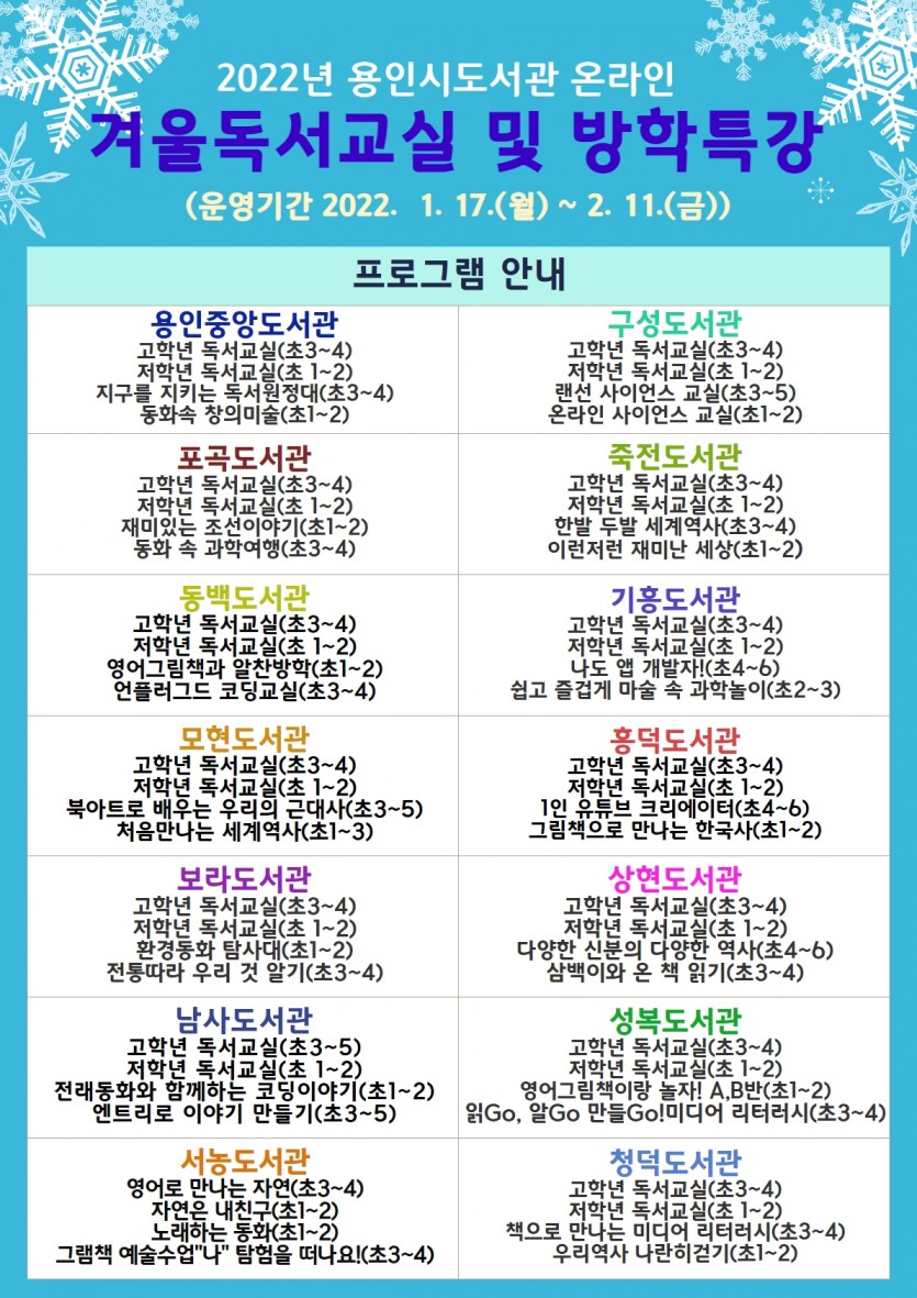“온라인 겨울독서교실·방학특강 참가 신청하세요” 용인시 도서관사업소, 오는 28일부터 홈페이지 접수 - 김경순 기자 2021-12-23 09:54 가 본문내용 확대/축소 본문 “온라인 겨울독서교실·방학특강 참가 신청하세요” 용인시 도서관사업소가 겨울방학을 맞은 어린이들을 위한 ‘2022년 온라인 겨울독서교실 및 방학특강’을 준비했다. 화상회의 앱인 줌(ZOOM)과 웨일온(Whale ON) 등으로 내년 1월 17일부터 2월 11일까지 진행하는 이번 프로그램은 코로나19로 바깥 활동이 어려운 아이들에게 책과 친해질 수 있는 기회를 제공하기 위해 용인중앙, 포곡, 동백, 보라, 구성, 죽전, 기흥, 상현 등 관내 14개 도서관이 기획했다. 다양한 책들을 함께 읽어보고 독후 활동을 진행하는 독서교실을 비롯해 동화 속 창의미술(용인중앙), 언플러그드 코딩교실(동백), 랜선 사이언스 교실(구성), 나도 앱 개발자!(기흥), 다양한 신분의 다양한 역사(상현), 영어그림책이랑 놀자!(성복), 책으로 만나는 미디어 리터러시(청덕)등 총 56개의 프로그램을 마련했다. 관내 초등학생은 누구나 참여할 수 있으며, 참가 신청은 오는 28일부터 각 도서관 홈페이지에서 선착순으로 마감한다. 시 도서관사업소 관계자는 “코로나19로 인해 많은 시간을 집에서 보내야 하는 아이들을 위해 준비했다”면서 “이번 프로그램을 통해 책과 친해질 수 있는 유익한 겨울방학이 되길 바란다”고 말했다. 한편 자세한 내용은 각 도서관 홈페이지 또는 용인시 도서관사업소 홈페이지를 참고하면 된다. 좋아요 0 싫어요 0 김경순 기자 기자의 다른기사 보기 목록 댓글목록 이전글 용인시 12월 24일(금) 보도자료 21.12.24 다음글 "경안천 수변 따라 아름다운 야경 보러 오세요" 21.12.23
