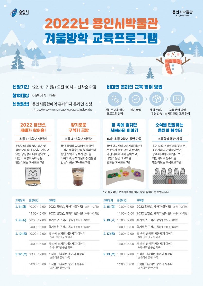 “이번 겨울방학은 용인시박물관과 함께해요” 오는 17일부터 겨울방학 교육프로그램 참가자 선착순 모집 김경순 기자 2022-01-10 07:32 가 본문내용 확대/축소 본문 “이번 겨울방학은 용인시박물관과 함께해요” 용인시박물관이 겨울방학을 맞아 아이들을 위한 다채로운 교육프로그램을 준비했다. 다음달 8일부터 19일까지 화상회의 앱인 줌(ZOOM)으로 진행되는 ‘2022년 용인시박물관 겨울방학 교육프로그램’은 새해를 맞아 십이지신과 용인의 역사를 쉽고 재밌게 만날 수 있는 시간으로 꾸며진다. 올해의 동물인 호랑이와 열두 띠 동물의 유래를 살펴보는 ‘2022 임인년, 새해가 왔어흥!’을 비롯해 용인 동백 지역의 구석기 문화에 대해 알아보는 ‘향기로운 구석기 공방’, 서봉사지 출토 유물과 연계한 ‘땅속에 숨겨진 서봉사지 이야기’, 용인 석성산 봉수터 유적지와 봉수 전달 체계를 알아보는 ‘소식을 전달하는 용인의 봉수터’가 차례로 진행된다. 6세 이상부터 초등학교에 재학 중인 어린이와 그 가족이라면 누구나 참여할 수 있으며, 참가자는 오는 17일부터 용인시 통합예약 홈페이지(https://www.yongin.go.kr/resve/index.do)에서 선착순으로 모집한다. 용인시박물관 관계자는 “이번 프로그램을 통해 어린이들이 즐겁고 알찬 겨울방학을 보낼 수 있길 바란다”며 “많은 관심과 신청 바란다”고 말했다. 좋아요 0 싫어요 0 김경순 기자 기자의 다른기사 보기 목록 댓글목록 이전글 용인시, 다자녀 가정 도서대출 확대 서비스 시행 22.01.10 다음글 "노후 보일러, 저녹스 보일러로 교체하세요" 22.01.10