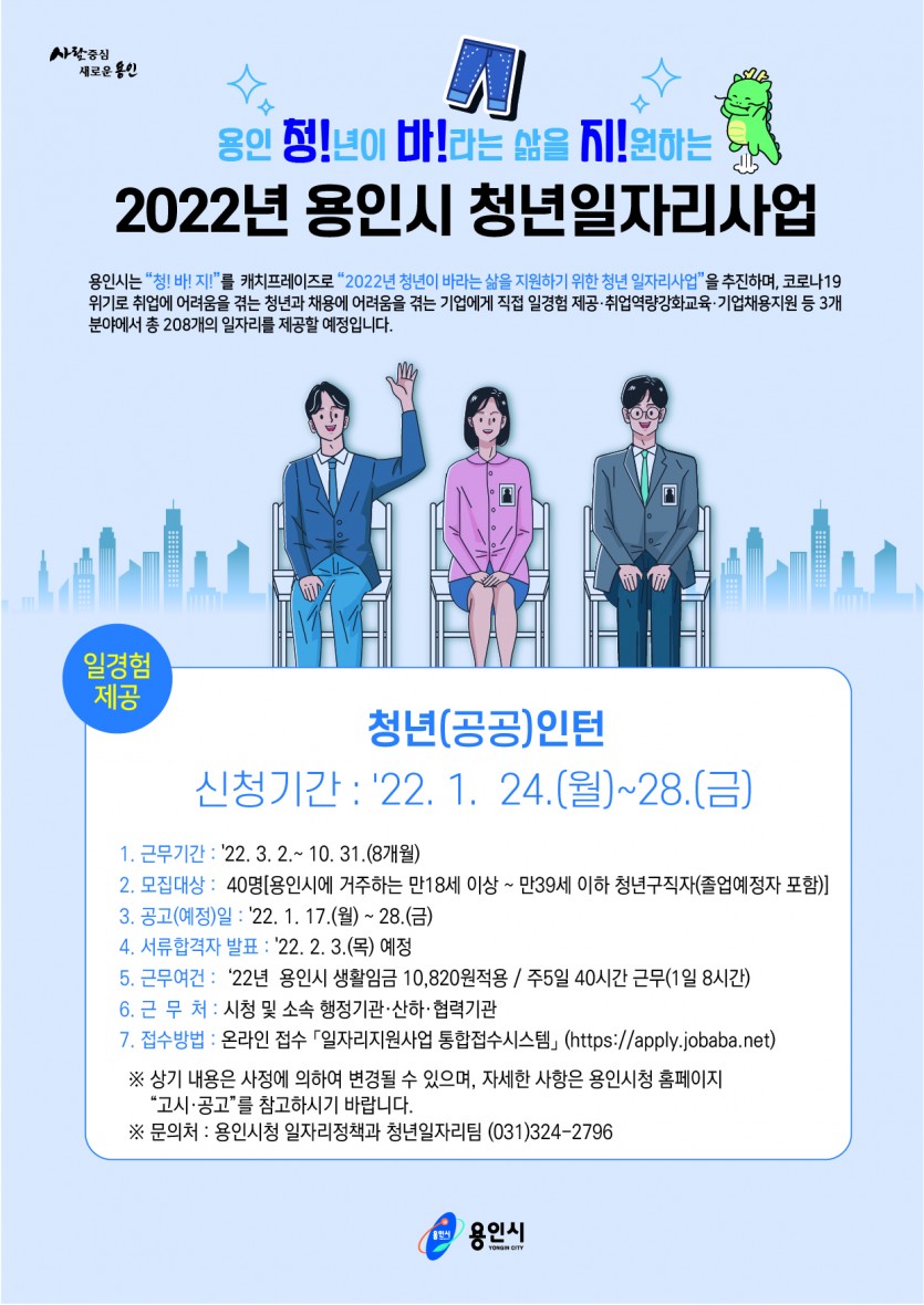 용인시가 청년 구직자에게 경력 형성 기회를 제공하기 위해 오는 24일부터 28일까지 청년인턴 40명을 모집한다고 밝혔다.