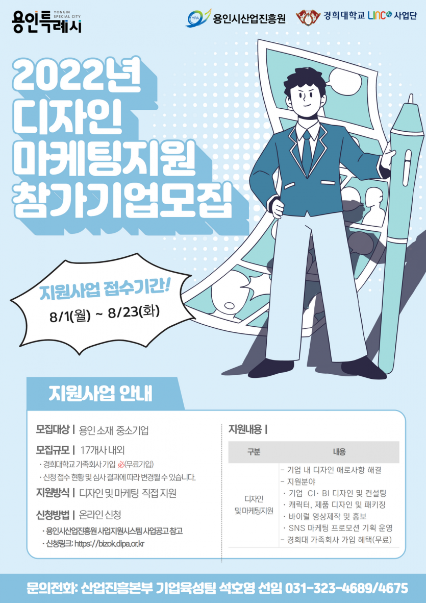 용인시산업진흥원, 2022년 중소기업 디자인마케팅 지원사업 참가기업 모집 경희대학교 LINC 3.0사업단과 공동추진- 김경순 기자 2022-08-04 10:30 가 본문내용 확대/축소 본문 용인시산업진흥원, 2022년 중소기업 디자인마케팅 지원사업 참가기업 모집 용인시산업진흥원(원장 김윤석, 이하 진흥원)은 경희대학교 LINC 3.0사업단과 같이 8월 1일부터 8월 23일까지 ‘2022년 중소기업 디자인마케팅지원사업’ 참가기업을 모집한다. 본 사업은 진흥원과 경희대 LINC 3.0사업단이 처음으로 공동 진행하는 사업으로 지난 7월 6일 상호 업무협약을 체결했다. 진흥원은 관내 기업정보 및 다양한 홍보채널을 활용해 참가기업 모집·홍보를 전담하고 경희대는 디자인 대학 내 학생 및 지도교수가 기업의 디자인, 마케팅, 홍보 등의 기업 현안 해결을 직접 지원한다. 이번 사업으로 양 기관은 관내 중소기업 총 17개사를 지원하며, 선정 기업들은 별도 자부담금 없이 ▲제품·패키징 디자인, ▲바이럴 영상제작, ▲SNS 마케팅 프로모션 기획, ▲기업 CI·BI 디자인 및 컨설팅 등의 수혜를 받을 수 있다. 용인소재 본사 또는 공장이 있는 경희대학교 가족회사 중소기업이면 누구나 신청 가능하며, 경희대학교 가족회사가 아닌 관내 중소기업의 경우 신청접수와 가족회사 무료 가입을 함께 진행하면 된다. 진흥원 관계자는 “타 지원사업 대비 마케팅 지원에 대한 높은 기업 수요에 부응하고자 경희대학교와 협업하여 디자인 마케팅 지원사업을 신규로 추진하게 되었다.”라며 “본 사업을 통해 관내 중소기업의 매출증대, 고용창출 등 기업경쟁력 강화와 강소기업으로의 성장 계기가 되길 바란다.”라고 밝혔다. 지원사업 신청은 진흥원 지원사업관리시스템(https://bizok.dipa.or.kr)을 통해 온라인으로 신청이 가능하며, 접수방법 등 자세한 내용은 용인시산업진흥원 홈페이지(http://ypa.or.kr) 내 사업공지를 참고하면 된다. 좋아요 0 싫어요 0 김경순 기자 기자의 다른기사 보기 목록 댓글목록 이전글 용인시산업진흥원 “온라인 판로개척‘멘토링 데이’참여기업 모집” 22.08.04 다음글 용인시가족센터] 결혼이민자들의 한국적응을 위한 한식 요리교실 ‘행복한 밥상’ 22.08.04