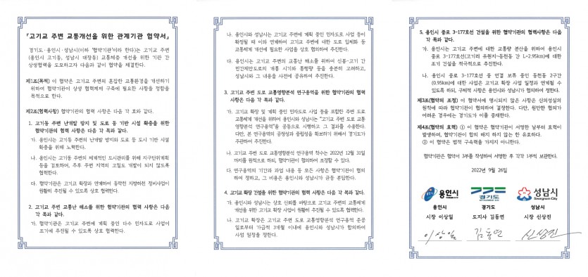 이상일 용인특례시장, 고기교 교통불편 해소의 길 뚫었다 - 관내 상습 체증지역 문제 해결 돌파구 마련…26일 경기도·성남시와 업무협약 - 소비환경뉴스 2022-09-27 00:48 가 본문내용 확대/축소 본문 이상일 용인특례시장, 고기교 교통불편 해소의 길 뚫었다 용인특례시(시장 이상일)가 만성적인 교통체증을 빚고 종종 수해까지 발생하는 수지구 동천동(법정명 : 고기동) 고기교 주변 교통개선을 위해 경기도·성남시와 업무협약을 맺었다고 26일 밝혔다. 앞서 지난 7월 초 이상일 용인시장이 신상진 성남시장과 두 도시의 발전을 위해 고기교 확장과 주변도로 확충 등에 공동 협력키로 한 데 따른 후속 조치다. 이날 도청 상황실에서 열린 협약식엔 이상일 용인특례시장을 비롯해 김동연 경기도지사와 신상진 성남시장, 안철수 국회의원(성남 분당갑), 정춘숙 국회의원(용인병), 강웅철 도의원(용인) 등 10여명이 참여했다. 협약은 ▲고기동 주변 도로 등 도시기반 시설 확충 ▲민자도로 사업계획과 연계한 교통난 해소 대책 ▲고기교 주변 도로 교통영향분석 연구용역 추진 ▲고기교 확장 건설 협력 ▲용인시 중로 3-177호선 조기 건설 추진 등의 내용을 담았다. 협약에 따라 경기도는 ‘주변 도로 교통영향분석 연구 용역’을 올해 안에 의뢰하고 용인시와 성남시는 용역 완료 후 3개월 이내에 고기교 확장 사업이 원활히 추진되도록 협력하게 된다. 용역 비용은 양 시가 공동 분담한다. 이 시장은 “고기교는 고질적인 교통 정체와 침수 피해로 시민들이 큰 불편을 겪어왔지만 두 도시 사이에 오랜 기간 긴밀한 협력 시스템이 잘 작동되지 않아 문제가 방치돼왔다”며 “민선8기가 시작되자마자 신상진 성남시장, 안철수 의원과 문제의 조속한 해결에 합의한 바 있고, 김동연 지사도 적극 협력해주셔서 오늘 난제를 해결하는 큰 계기가 마련됐다”고 말했다. 이 시장은 “협약 내용이 좋은 만큼 이제 실천이 중요하다”며 “연구용역 결과가 나오는 대로 성남시와 함께 고기교 일대 교통망을 확충하고 인근 도시개발사업과 연계해서 교통기반시설도 잘 마련될 수 있도록 할 것”이라고 밝혔다. 이 시장은 “고기교 주변 문제 해결에 큰 도움을 주신 김동연 도지사와 신상진 시장, 안철수 · 정춘숙 국회의원 등께 감사 인사를 드린다”며 “용인과 성남이 이 문제를 잘 해결해서 전국 자치단체 간 모범적인 협치 모델을 만들겠다”고 말했다. 이 시장은 “고기교와 주변도로가 정비되면 지난 8월과 같은 수해가 고기교 주변에서 반복되지는 않을 것”이라며 “고기교 일대 교통개선을 위해 용인과 성남이 합의한 대로 일을 신속하게 추진해 나가겠지만 경기도도 도비 지원 등을 통해 지속적인 관심을 기울여주면 좋겠다”고 했다. 이 시장은 또 “고기교에 인도가 없어 시민 안전이 우려되므로 인도는 지금 당장 설치할 필요가 있다”며 “인도 설치에 필요한 비용 절반을 성남시가 부담해주면 좋겠다”고 말했다. 이에 신상진 성남시장은 “고기교 인도 설치 비용 절반을 부담하겠다”고 흔쾌히 동의했다. 신 시장은 “두 도시 시민 불편을 오랫동안 야기해왔던 고기교 문제의 돌파구를 이상일 시장과 함께 마련한 것을 뜻깊게 생각한다”고 말했다. 고기교는 동천동과 성남시 대장동을 연결하는 길이 25m, 폭 8m의 왕복 2차로 교량으로 만성적인 교통정체를 빚어왔다. 이같은 불편 해소를 위해 고기교 확장과 주변 도로망 확충 필요성이 대두됐지만, 용인시와 성남시의 입장이 달라 문제 해결이 지연돼왔다. 이런 가운데 지난 8월 쏟아진 폭우(534mm)로 동막천이 범람하면서 고기교와 함께 도로시설과 주택, 상가 등이 침수돼 용인시는 38억원(시 추산) 가량의 피해를 입었다. 이에 이상일 시장은 이상민 행정안전부장관에게 고기교 일대를 포함한 동천동을 특별재난구역으로 선포해 달라고 요청했으며, 정부는 지난 1일 이를 수용해 동천동을 특별재난구역으로 지정하고 피해복구비용 등을 지원하기로 했다. 시는 앞서 지난달 21일 경기도에 동막천 추가 준설에 필요한 예산 1억5000만원을 지원해줄 것과 도가 계획하고 있는 동막천 지방하천정비사업 시기를 앞당겨 달라고 요청했다. 이에 도는 현재 동막천 준설에 필요한 예산이 경기도의회 2회 추경 심의 중이며 동막천을 포함한 지방하천 정비사업은 설계용역 입찰 공고 중이라고 밝힌 바 있다. 좋아요 0 싫어요 0 소비환경뉴스 기자의 다른기사 보기 목록 댓글목록 이전글 지구를 위한 재활용품 아이디어를 ICT로 UP! grade! - 용인시산업진흥원, 제3회 업사이클링 메이커톤 성료 22.09.27 다음글 동백2동, 동 나뉜 뒤 첫 동민의 날 ‘화합 잔치’ 벌였다 22.09.26