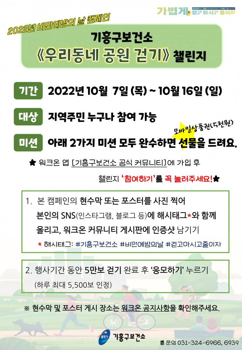 “함께 걷고 물 마시며 조금 가벼워져 볼까요?” - 용인특례시, 비만예방의 날(10월 11일) 기념해 3개구 보건소서 걷기 챌린지 진행 김경순 기자 2022-10-10 09:21 가 본문내용 확대/축소 본문 “함께 걷고 물 마시며 조금 가벼워져 볼까요?” 용인특례시 3개구 보건소는 비만예방의 날(10월 11일)을 맞아 시민들이 참여하는 걷기 행사를 진행한다고 10일 밝혔다. 행사는 이번 비만예방의 날 슬로건인 ‘가볍게 일상에서 걷고, 물을 마시고, 나트륨·지방 줄이자’의 취지에 따라 일상 속 걷기에 초점을 둬 운영된다. 처인구보건소는 10일부터 16일까지 처인구 주민을 대상으로 걷기 챌린지와 비만예방의 날 기념 4행시 캠페인을 진행, 미션 달성자에게 소정의 모바일 상품권을 증정한다. 걷기 챌린지와 4행시 캠페인에 참가하려면 스마트폰에 ‘워크온’ 어플을 설치한 뒤 처인구보건소 공식 커뮤니티에 가입해야 한다. 걷기 챌린지는 참가 신청을 하고 목표를 달성하면 되는데, 매일 6000보 이상을 걷고 기간 내 누적 4만2000보 이상 기록을 달성한 뒤 선물 응모하기 버튼을 누르면 된다. 성공한 사람 가운데 200명을 추첨해 5000원 상당의 모바일 상품권을 증정한다. 당첨자는 게시판 공지한 후 등록된 휴대폰 문자메시지를 통해 상품권을 보내준다. 비만 예방의 날 기념 4행시 행사는 커뮤니티 게시판에 ‘비만예방’, ‘다이어트’, ‘신체활동’, ‘건강체중’ 가운데 1가지를 선택해 4행시를 쓰고 본인 글을 제외한 다른 사람의 글에 ‘좋아요’를 누르면 된다. ‘좋아요’가 가장 많은 상위 10명을 선발해 1만원 상당의 모바일 상품권을 증정한다. 기흥구보건소는 7일부터 16일까지 비만예방 캠페인 챌린지를 실시한다. 참가하려면 스마트폰에 워크온 어플을 설치한 뒤 기흥구보건소 공식 커뮤니티에 가입하면 된다. 챌린지는 기흥구 15개동 행정복지센터와 9개 공원에 게시된 비만예방의 날 홍보 포스터나 현수막 사진을 찍어 SNS에 해시태그(#기흥구보건소 #비만예방의날 #걷고마시고줄이자)와 함께 게시한 뒤 워크온 어플 게시판에 인증샷을 올리고, 행사기간 동안 5만보 걷기(하루 최대 5500보 인정) 완료 후 응모하기 버튼을 누르면 된다. 성공한 사람 100명을 추첨해 5000원 상당의 모바일 상품권을 증정한다. 수지구보건소는 11일 오전 10시부터 지역 주민 100여명이 참여하는 걷기 행사를 진행한다. 참가자들은 이날 정평천~탄천 왕복 6㎞ 걷기 코스를 함께 걷는다. 참가자들에게는 캠페인 슬로건이 인쇄된 생수와 수건 등의 기념품을 제공한다. 쾌적한 수변 산책로를 걸으며 선선한 가을 정취까지 느낄 수 있는 특별한 경험을 선사한다. 이날 수지구보건소는 관내 어린이집 2곳을 방문해 비만 체험 행사와 영양교육을 진행해 어린이들에게 건강한 생활 습관을 갖도록 돕고 가족들과 함께 해볼 수 있는 보드 놀이와 교육 자료 등도 제공할 예정이다. 아울러 지역주민이 비만에 대한 경각심을 가질 수 있도록 보건복지부와 함께 ‘더(The) 건강’ 캠페인을 진행, 10월 한 달간 신분당선 수지구청역사 내에 비만예방의 날 슬로건이 인쇄된 대형 광고물을 부착한다. 보건소 관계자는 “비만은 그 자체로도 삶의 질을 크게 떨어뜨리지만 무엇보다도 심장병, 뇌졸중, 당뇨병 등의 심각한 질병들의 원인 질환이 될 수 있다”며 “시민들이 비만에 대해 경각심을 갖고 일상에서 비만을 예방할 수 있는 생활 습관을 갖도록 이 같은 행사를 마련했다”고 말했다. 한편 대한비만학회와 보건복지부는 지난 2010년부터 매년 10월 11일을 ‘비만예방의 날’로 지정, 비만에 대한 국민들의 바른 인식과 효과적인 관리를 위한 다양한 캠페인을 하고 기념행사 등을 진행해오고 있다. 좋아요 0 싫어요 0 김경순 기자 기자의 다른기사 보기 목록 댓글목록 이전글 손자녀 양육 어렵죠? 죽전2동, 조부모 육아강좌 22.10.10 다음글 ‘임 향한 일편단심’ 정몽주 기리는 용인 포은문화제 14일부터 열린다 22.10.10