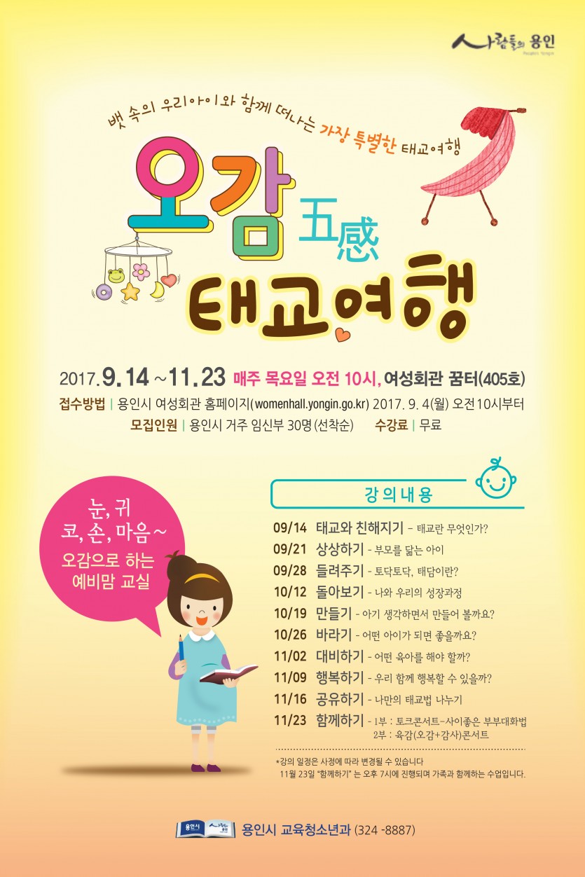 강좌는 다음달 14일부터 11월 23일까지 총 10주간 진행되며 상상하기, 들려주기, 돌아보기, 만들기, 바라기, 대비하기 등을 주제로 오감을 활용한 태교와 건강한 인성을 가진 아이를 출산해 행복한 가정을 만드는 방법 등을 안내한다.