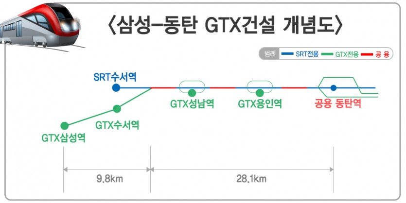 서울 삼성역과 화성시 동탄역 사이 37.9km 구간 가운데 수서역 인근~동탄역 구간은 이미 운행 중인 수서발 고속열차 SRT 선로 28.1km를 이용하고 수서역 인근에서 삼성역까지 9.8km를 신설하는 방식으로 건설된다.