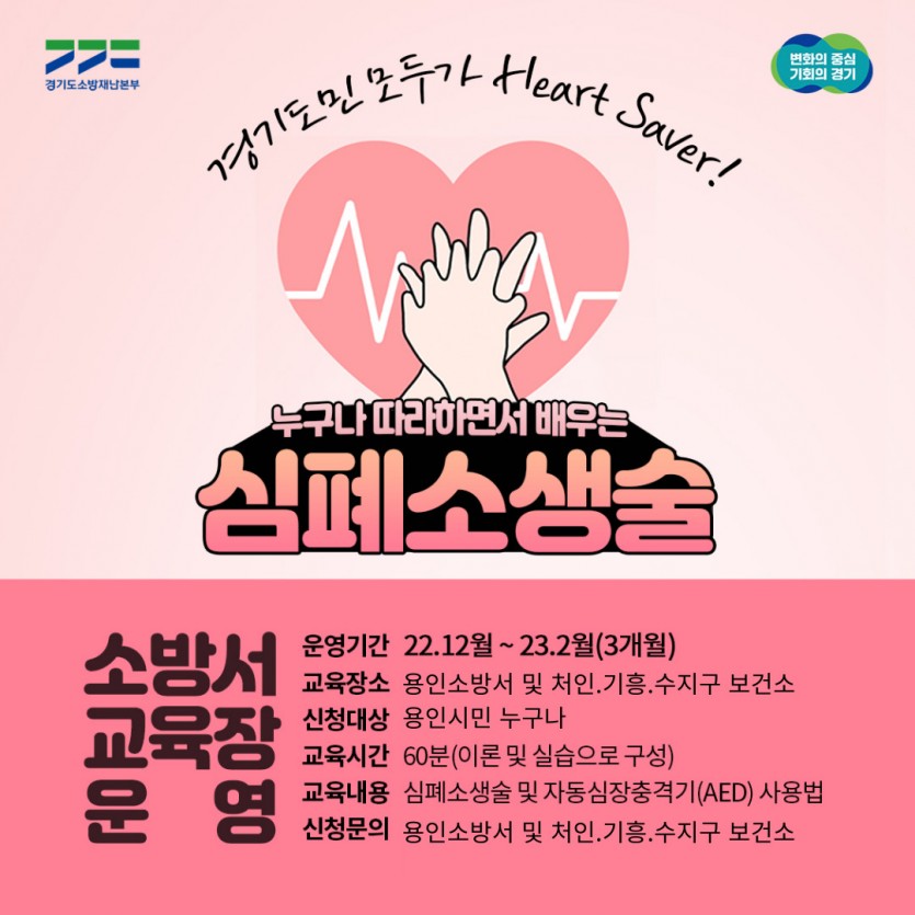 용인소방서(서장 서승현)는 내년 1월부터 2월 말까지 처인구․기흥구․수지구 보건소와 용인소방서에서 상설 심폐소생술 교육장을 운영한다고 밝혔다.