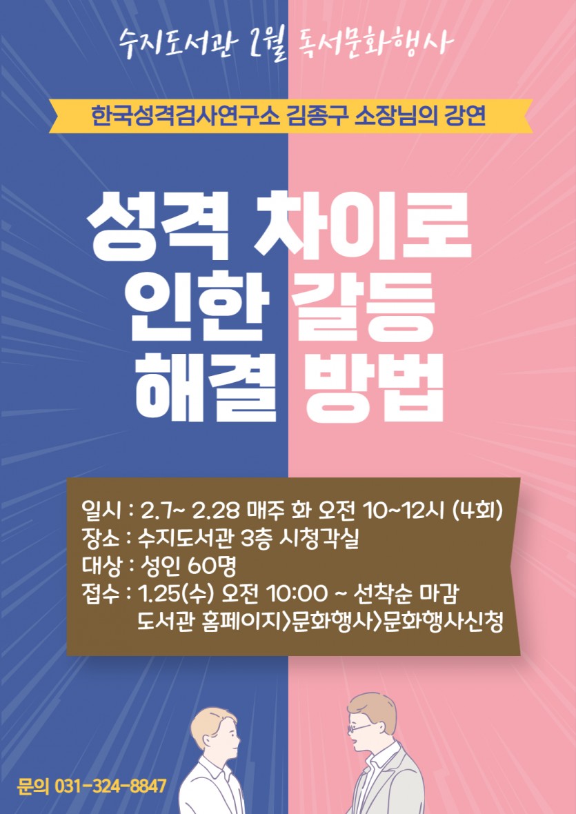 난초남편 매화아내? 성격차이 갈등해결사 그분이 온다 - 용인특례시 수지도서관, 내달 7~28일…4군자 기질검사 원조‘김종구 특강’ 김경순 기자 2023-01-19 07:31 가 본문내용 확대/축소 본문 난초남편 매화아내? 성격차이 갈등해결사 그분이 온다 용인특례시(시장 이상일)가 성격 차이로 대인관계에 어려움을 겪고 있는 시민들을 위해 김종구 한국성격검사연구소 소장의 갈등 해결법 특강을 연다. 강의는 다음 달 7일부터 28일까지 매주 화요일 오전 10~12시마다 수지도서관 3층 시청각실에서 열린다. 前 한국MBTI연구소 교육부장을 역임한 김 소장은 ‘당신의 성격 5분이면 알 수 있다’ 등 저서를 펴냈다. 교육에서는 매난국죽 등 사군자로 풀어낸 한국형 기질검사인 사군자 기질검사를 통해 나의 기질을 파악한 뒤 다른 기질과의 차이를 이해하는 시간을 갖는다. 또 기질에 따른 욕구의 차이를 알아보고 가족이나 친구, 동료 등 타인과의 갈등을 효과적으로 해결할 수 있는 실천 방법을 다양한 사례를 통해 알기 쉽게 소개할 예정이다. 교육에 참여하려면 오는 25일 오전 10시부터 수지도서관 홈페이지(https://lib.yongin.go.kr/suji)를 통해 신청하면 된다. 시는 선착순으로 60명을 모집한다. 시 관계자는 “사람은 저마다의 성격과 기질이 달라 원만한 대인관계를 맺는 데 크고 작은 어려움을 겪게 마련이다”라며 “성격 차이로 갈등을 빚고 있는 시민들이 이번 강연을 통해 소통에 도움이 되는 정보를 얻기 바란다”고 말했다. 좋아요 0 싫어요 0 김경순 기자 기자의 다른기사 보기 목록 댓글목록 이전글 용인시산업진흥원, 2023년 용인시 소상공인 디자인 지원사업 모집 공고 게시 23.01.19 다음글 이형주 처인구청장, 설 명절 앞두고 장애인복지시설 방문 23.01.19