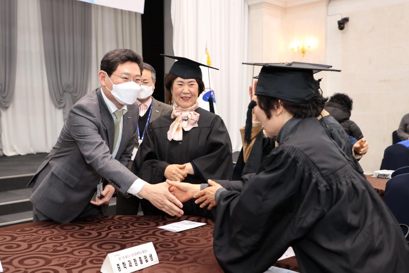 “나도 이젠 졸업장이 생겼어요”어르신‘문해학교’감격의 졸업식 - 이상일 용인특례시장 “어르신들이 보여주신 배움에 대한 열의와 열정 본받을 수 있도록 노력하겠다”- 김경순 기자 2023-02-24 22:21 가 본문내용 확대/축소 본문 “나도 이젠 졸업장이 생겼어요”어르신‘문해학교’감격의 졸업식 만학도 졸업생들의 환한 미소가 가득한 특별한 졸업식이 열렸다. 코로나-19로 인해 많은 어려움 속에서도 남다른 열정으로 학업에 집중한 성인문해학교 졸업생들이 그 주인공이다. 이상일 용인특례시장은 24일 시청 3층 컨벤션홀에서 열린 제11회 용인시 성인문해학교 졸업식을 찾아 11명의 졸업생에게 졸업장을 전달하고 축하 인사를 전했다. 이상일 시장은 이날 졸업식에서 졸업장, 초ㆍ중등학력인정서, 용인시장 표창, 경기도교육감 표창 등을 전달했다. 용인시 성인문해학교는 배움의 시기를 놓친 용인시민들에게 문해 능력 및 학력 취득 기회를 제공하기 위해 시가 지난 2012년부터 운영하고 있는 프로그램이다. 이번 졸업식에선 2022년에 입학한 초등학교 과정 6명, 2020년에 입학해 3년의 과정을 마친 중등과정 5명 등 총 11명이 졸업했다. 이상일 용인특례시장은 “학업에 열의를 갖고 문해 과정을 열심히 마친 모든 분께 감사하다는 말과 축하 인사를 드린다. 존경스럽다”며 “여러분이 보여주신 배움에 대한 열의와 열정 저도 더 본받을 수 있도록 노력하겠다”고 말했다. 이상일 시장은 “괴테의 파우스트를 보면, 파우스트가 보여주는 배움에 대한 열정이 있다. 파우스트가 공부도 많이 하고 지식을 많이 쌓았지만, 여전히 배움에 허기를 느껴 악마의 유혹에도 빠지고, 도전을 하는 과정들이 나온다”며 “이렇듯 배움에 끝은 없다고 생각한다. 배움에 끝은 없지만 배움의 결실은 뜻깊을 것이다. 다시 한번 열정과 열의를 본받을 수 있도록 노력하겠다”고 축사를 마무리했다. 좋아요 0 싫어요 0 김경순 기자 기자의 다른기사 보기 목록 댓글목록 이전글 용인특례시, (사)희망을 나누는 사람들서 1억5천만원어치 생필품 기탁 23.02.24 다음글 용인시산업진흥원, 예비·초기창업기업 대상 23.02.24