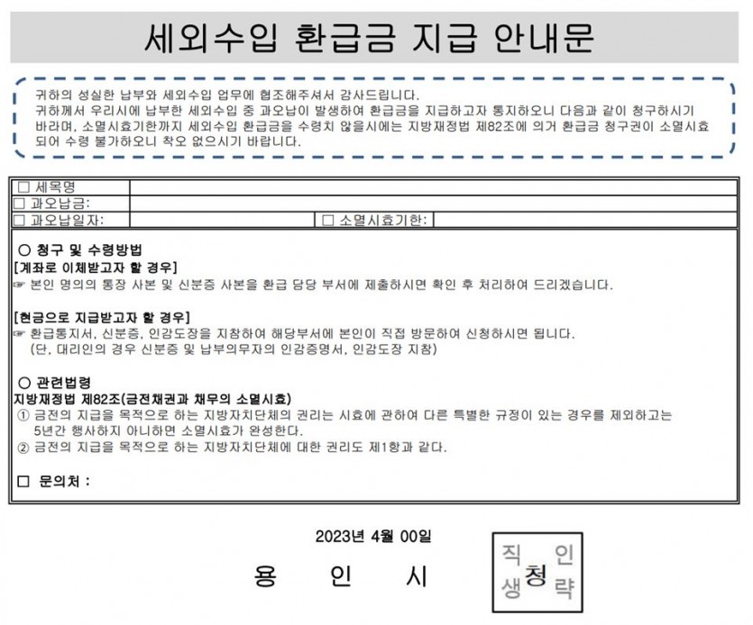 용인특례시, 몰라서 못받은 세외수입 환급 내달28일까지 지급해요 - 납세자에게 안내문 발송…355건, 과·오납금 1억여원 환급분 집중 정리키로- 김경순 기자 2023-03-27 08:34 가 본문내용 확대/축소 본문 용인특례시, 몰라서 못받은 세외수입 환급 내달28일까지 지급해요 용인시가 올해 상반기 세외수입에 대한 과·오납금 환급 집중 기간을 운영해 355건에 대해 1억여원을 환급한다고 27일 밝혔다. 시는 지난 23일부터 다음달 28일까지 환급 집중 정리 기간을 운영해 환급금 존재 여부를 인식하지 못한 납세자를 대상으로 환급안내문을 발송하거나 직접 연락해 환급지급률을 높인다. 대상자는 안내문에 기재된 방법으로 신청하면 본인 계좌로 세외수입 과·오납금을 환급 받을 수 있다. 다만 세외수입이나 지방세를 체납하고 있는 환급대상자는 법령에 규정된 체납액 충당 절차에 따라 체납액을 제외한 나머지 금액을 돌려받게 된다. 시 관계자는 “시민들에게 신뢰받는 세정 구현을 위해 세외수입 과·오납금 환급을 부서별로 진행했다”며 “환급 집중 정리 기간을 매년 상‧하반기 연 2회 운영할 예정”이라고 말했다. 좋아요 0 싫어요 0 김경순 기자 기자의 다른기사 보기 목록 댓글목록 이전글 용인특례시, 시 심볼마크·마스코트·브랜드 괜찮나요 23.03.27 다음글 용인어린이상상의숲, 새봄맞이 신규 콘텐츠 오픈 23.03.23