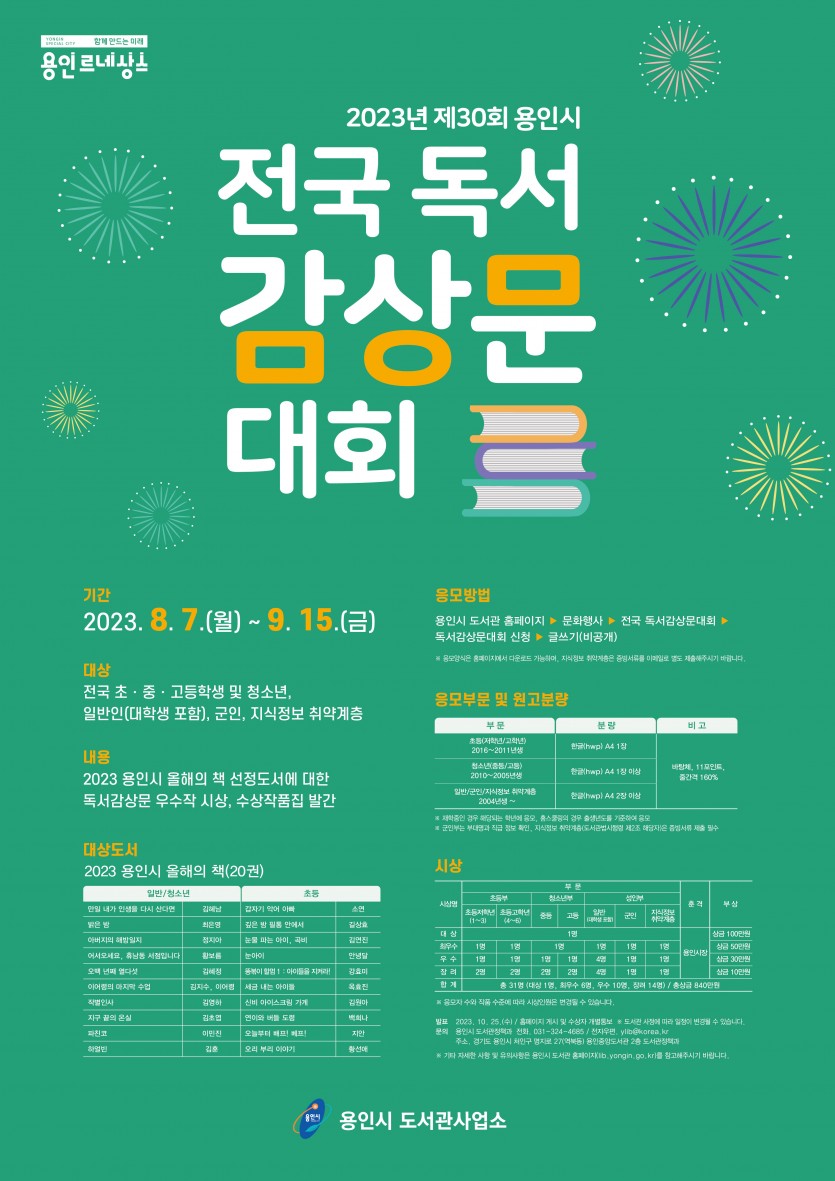 전국민 응모 가능!... 용인특례시, 내달 15일까지 독서감상문대회 - 초등부·청소년부·성인부 등 3개 부문 7개 분야 31점 선정 - 김경순 기자 2023-08-10 20:36 가 본문내용 확대/축소 본문 전국민 응모 가능!... 용인특례시, 내달 15일까지 독서감상문대회 전 국민이 응모할 수 있는 독서감상문대회가 용인특례시에서 다음 달 15일까지 열린다. 용인특례시(시장 이상일)는 지난 7일 막을 올린 ‘제30회 용인시 전국독서감상문대회’에 전국 독서 애호가들의 참여를 기다린다고 10일 밝혔다. 참여를 원하는 대한민국 국민은 올해 시가 선정한 ‘용인시 올해의 책’ 20권 중 한 권을 읽고 독서감상문을 작성해 용인시도서관 홈페이지(lib.yongin.go.kr)를 통해 제출하면 된다. 응모 분야는 ▲초등부(저학년‧고학년) ▲청소년부(중‧고등) ▲성인부(일반‧군인‧지식정보 취약계층) 등 3개 부문 7개 분야다. 원고는 한글워드프로세서(HWP)에서 글자 크기 11포인트, 줄 간격 160%로 설정한 상태에서 초등부 A4 1장, 청소년 A4 1장 이상, 성인부 A4 2장 이상 작성해야 한다. 청소년부와 성인부 대상의 ‘올해의 책’은 ‘만일 내가 인생을 다시 산다면’(김혜남), ‘밝은 밤’(최은영), ‘아버지의 해방일지’(정지아), ‘어서오세요, 휴남동 서점입니다’(황보름), ‘오백 년째 열다섯’(김혜정), ‘이어령의 마지막 수업’(김지수, 이어령), ‘작별인사’(김영하), ‘지구 끝의 온실’(김초엽), ‘파친코’(이민진), ‘하얼빈’(김훈) 등 10권이다. 초등부는 ‘갑자기 악어 아빠’(소연), ‘깊은 밤 필통 안에서’(길상효), ‘눈물 파는 아이, 곡비’(김연진), ‘눈아이’(안녕달), ‘똥볶이 할멈 1 : 아이들을 지켜라!’(강효미), ‘세금 내는 아이들’(옥효진), ‘신비 아이스크림 가게’(김원아), ‘연이와 버들 도령’(백희나), ‘오늘부터 배프! 베프!’(지안), ‘오리 부리 이야기’(황선애) 등 10권 중 한 권을 읽으면 된다. 시는 응모작을 대상으로 내용 이해도와 감정표현, 문장력 등을 평가해 전체 대상(1작품)을 비롯해 부문별로 최우수상, 우수상, 장려상 등 총 31점의 우수작을 선정, 오는 10월 말 발표한다. 수상자에게는 용인시장상과 상금(총 840만원)을 수여한다. 또 31점의 작품을 ‘처인성’이라는 이름의 문집으로 발간, 시민 누구나 열람할 수 있도록 지역 내 18개 공공도서관에 비치한다. 시 관계자는 “책 읽는 분위기를 조성하기 위해 지난 1994년부터 개최해 온 독서감상문대회가 올해 30회를 맞았다”며 “용인시민이 선택한 20권의 ‘올해의 책’을 읽고 독서의 즐거움을 누리길 원하는 국민들이 적극적으로 참여해주기 바란다”고 말했다. 좋아요 0 싫어요 0 김경순 기자 기자의 다른기사 보기 목록 댓글목록 이전글 용인중앙도서관, 올여름 별 볼일 있네!…황홀한 천체사진전 23.08.10 다음글 용인문화재단, 새만금 세계스카우트잼버리 대원 3000여 명 초청해 문화체험 프로그램 제공 23.08.10