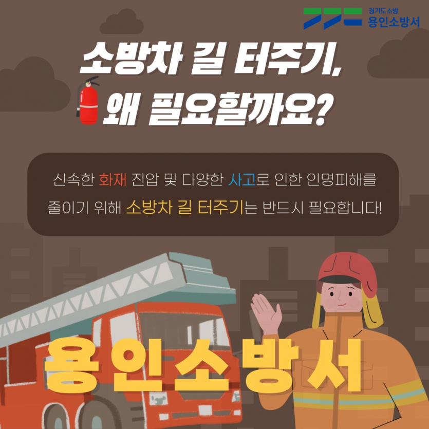 용인소방서, ‘소방차’가 지나는 길은 ‘생명’을 지키는 길… 전국 동시 ‘소방차 길 터주기’ 훈련 김경순 기자 2023-08-21 23:24 가 본문내용 확대/축소 본문 용인소방서, ‘소방차’가 지나는 길은 ‘생명’을 지키는 길… 전국 동시 ‘소방차 길 터주기’ 훈련 용인소방서(서장 서승현)는 2023년 을지연습‧민방위 훈련과 연계하여 ‘소방차 길 터주기’ 캠페인에 대한 국민적 공감대를 형성하기 위해 용인특례시 관내에서 훈련을 실시한다고 21일 밝혔다. 올해는 특별히 2023년 을지연습 및 민방위 훈련과 연계하여 같은 시간에 ‘전국의 모든 소방서’에서 훈련을 실시하며, 용인소방서에서는 8월 23일 목요일 오후 2시부터 약 15분간 처인구 역북동 및 김량장동 일대에서 훈련을 진행할 계획이다. 주요 내용으로는 ▲국민들의 긴급차량 양보 의식 향상 ▲올바른 길 터주기 요령 홍보 ▲소방출동로 확보 및 장애요인 제거 등이다. 소방차량 등 긴급차량 길 터주기 방법은 편도 1차로는 긴급차량이 진로를 확보할 수 있도록 우측 가장자리로 이동해 일시 정지하거나 서행하며, 편도 2차로는 긴급차량이 1차로를 주행할 수 있도록 2차선으로 이동해 서행하면 된다. 서승현 용인소방서장은 “‘소방차 길 터주기’훈련은 시민들의 협조가 상당히 필요하며 골든타임을 지킬 수 있는 최선의 방법”이라며 “소방차와 구급차가 신속히 재난 현장에 도착해 소중한 생명과 재산을 지킬 수 있도록 이번 훈련을 이해하고 동참해주시기를 바란다”라고 전했다. 좋아요 0 싫어요 0 김경순 기자 기자의 다른기사 보기 목록 댓글목록 이전글 이상일 용인특례시장, 김홍일 국민권익위원장에게 ‘광교 송전철탑 이설 문제’ 중재 요청 23.08.21 다음글 마약사범 검거 기여 프로골퍼, 표창·신고보상금 수여 23.08.21