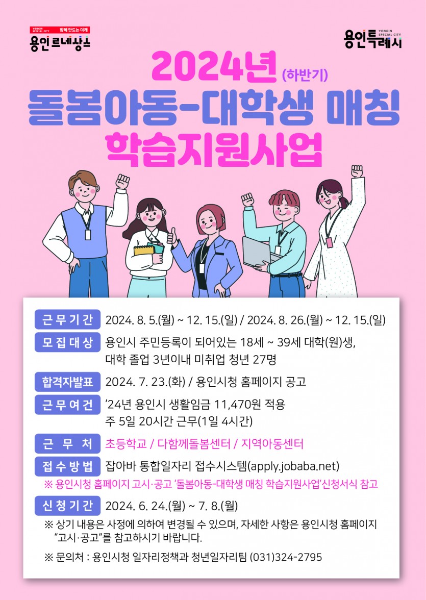 용인특례시, 하반기‘어린이 공부 돌봄’ 대학생 27명 모집 - 7월8일까지 접수…8~12월 초등학교 돌봄교실‧지역아동센터서 학습 지도 - 김경순 기자 2024-06-24 16:10 가 본문내용 확대/축소 본문 용인특례시, 하반기‘어린이 공부 돌봄’ 대학생 27명 모집 용인특례시(시장 이상일)는 다음 달 8일까지 지역 내 돌봄사각지대에 있는 아동을 위한 학습 도우미로 활동할 대학생 27명을 모집한다고 24일 밝혔다. 돌봄 사각지대에 놓인 아동과 시 거주 대학생을 연결해 청년에게는 전공과 적성을 살린 근무 경험을, 아동에게는 돌봄서비스를 제공하는 ‘돌봄 아동-대학생 매칭 학습지원’ 사업의 일환이다. 어린이 공부돌봄 대학생은 초등학교 돌봄교실, 다함께 돌봄센터, 지역아동센터 등에서 오는 8월부터 12월까지 하루 4시간씩 주 5일 교과목, 독서지도, 예술 분야 등의 학습 도우미 역할을 하게 된다. 시급은 올해 용인시 생활임금인 1만1470원을 지급한다. 신청 자격은 시에 주소를 둔 18세 이상 39세 이하 대학(원)생‧휴학생이거나 졸업 후 3년 이내 미취업 청년이다. 신청은 다음 달 8일까지 ‘일자리지원사업 통합접수시스템(https://apply.jobaba.net)’을 통해 신청할 수 있다. 서류전형과 면접을 통해 선발된 사람은 사전 교육을 받고 8월부터 용인특례시 기간제근로자로 근무하게 된다. 자세한 내용은 시청 일자리정책과(031-324-2795)로 문의하면 된다. 시 관계자는 “청년들에게는 전공과 적성을 살려 일할 기회를 제공하고 어린이들에는 안정적인 돌봄을 제공할 수 있는 좋은 제도인 만큼 열의가 있는 청년들의 많은 지원을 기대한다”고 말했다. 좋아요 0 싫어요 0 김경순 기자 기자의 다른기사 보기 목록 댓글목록 이전글 용인특례시, 새단장한 수지아르피아 파크골프장 7월 1일 재개장 24.06.26 다음글 용인특례시, 백암고・용인삼계고와 자율형공립고 2.0 추진 협약 체결 24.06.24