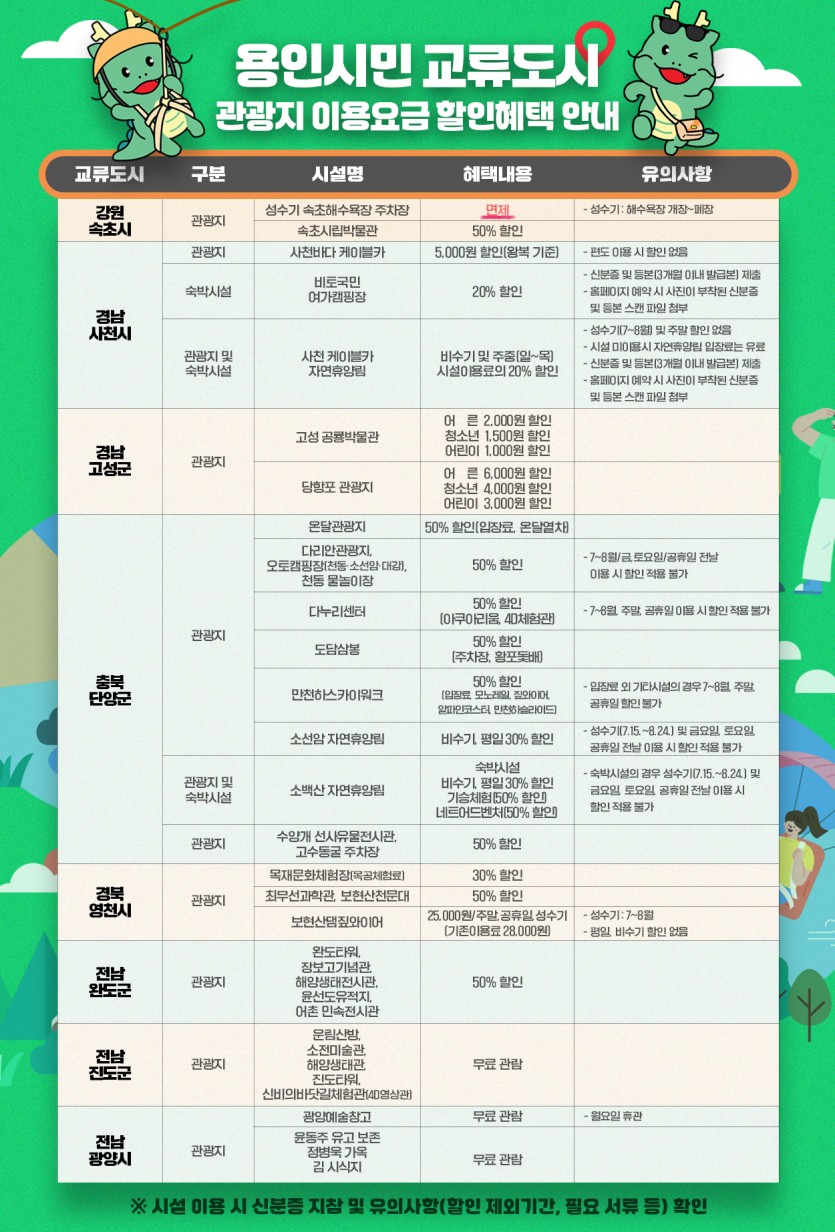 용인특례시민, 교류도시 관광지 할인 혜택 풍성 속초해수욕장 주차장 8.25까지 무료 등…전국 8개 시군 관광명소 할인 혜택 다양 - - 관광지마다 기간·내용·방법 등 달라 방문 전 해당 시설에 유선 확인 - 김경순 기자 2024-07-26 21:19 가 본문내용 확대/축소 본문 용인특례시민, 교류도시 관광지 할인 혜택 풍성 용인특례시(시장 이상일)는 국내 자매결연을 맺은 교류 도시들이 용인시민들에게 다양한 관광시설 할인 혜택을 제공한다고 24일 밝혔다. 관광지 할인 혜택을 제공하는 교류 도시는 경북 영천시, 전남 완도군, 경남 사천시, 경남 고성군, 강원 속초시, 충북 단양군, 전남 진도군, 전남 광양시 등 8개 시군이다. 용인특례시민은 성수기인 오는 8월 25일까지 강원도 속초해수욕장 이용 시 공영주차장을 무료로 이용할 수 있다. 방법은 해수욕장 남문 행정지원센터에서 쿠폰을 받아 출차 시 제시하면 된다. 속초시립박물관은 기간 제한 없이 관람료의 50%를 할인받는다. 전남 진도군을 방문하면 운림산방, 소전미술관, 해양생태관, 진도타워, 신비의바닷길 체험관 4D 영상관 총 5곳의 주요 관광지를 무료로 관람할 수 있다. 운림산방은 조선 후기 화가이자 추사 김정희의 제자 소치 허련이 살면서 그림을 그리던 곳으로, 연못과 정원이 어우러져 조화를 이루고 초가집과 소치기념관, 진도역사관 등이 있다. 신라시대 온달장군유적과 수려한 자연경관을 가진 충북 단양군은 온달관광지, 다리안 관광지, 천동 물놀이장, 도담삼봉 황포돛배, 만천하스카이워크, 고수동굴 주차장 등에서 50% 할인 받을 수 있다. 또한 국내 최초로 공룡 발자국이 발견된 경남 고성군의 공룡박물관과 당항포 관광지를 방문하면 최대 6천원의 입장료를 할인받을 수 있고, 경남 사천시의 경우 사천바다케이블카 이용 시 5천원 할인받을 수 있다. 그 외 경북 영천시, 전남 완도군, 전남 광양시 등 교류 도시 관광지의 다양한 할인 혜택은 용인시 홈페이지의 ‘용인 소개’ 목록에 교류 도시 할인 혜택에서 확인 할 수 있다. 용인시민 할인 혜택을 받기 위해서는 반드시 용인시민임을 증빙할 수 있는 서류(신분증, 미성년자의 경우 등본 등)를 지참해야 하며, 일부 시설의 경우 할인 제외 기간과 필요 서류 등 유의 사항 확인이 필요하니 방문 전 해당시설에 전화로 확인하면 불편함 없이 이용할 수 있다. 용인시 수지구에 거주하는 한 시민은 “올 여름휴가를 속초해수욕장으로 갈 예정인데 주차장을 무료로 이용할 수 있어 좋다”며 “혜택을 이용할 수 있는 다른 교류 도시들의 관광지를 찾아보는 재미도 있다”고 전했다. 이상일 용인특례시장은 “취임 후 도시 간 교류 활성화를 적극 추진해 국내 많은 도시와 자매 결연을 맺고 공동 협력 하고있다”며 “이번 휴가철 시민들이 교류 도시들의 다양한 혜택들 활용하시고 소소한 즐거움 누리셨으면 좋겠다”고 말했다. 좋아요 0 싫어요 0 김경순 기자 기자의 다른기사 보기 목록 댓글목록 이전글 무더위 타파! 시원하고 짜릿한 난타 퍼포먼스 24.07.26 다음글 연극 르네상스 꽃 피운 ‘제42회 대한민국연극제 용인’, 26일간의 대장정 마무리 24.07.26