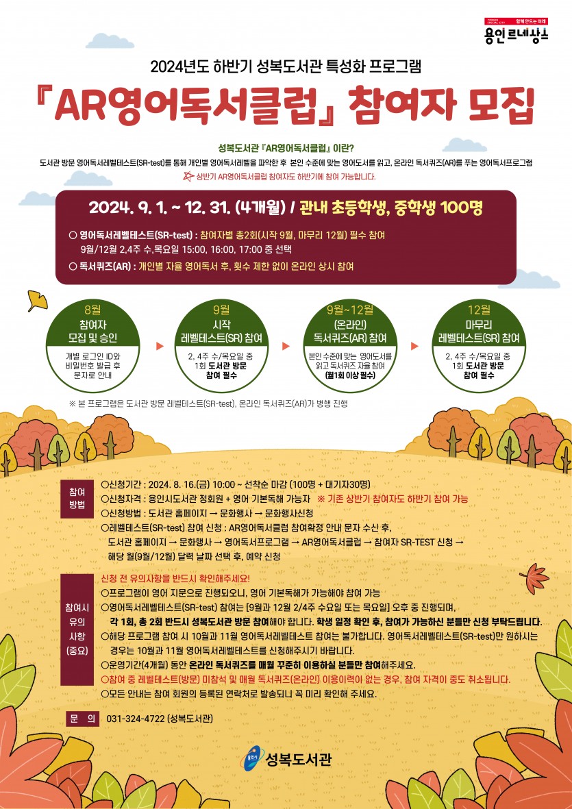 용인특례시(시장 이상일) 성복도서관은 2024년 하반기 ‘AR(Accelerated Reader)영어독서클럽’에 참여할 초·중학생 100명을 모집한다고 9일 밝혔다.