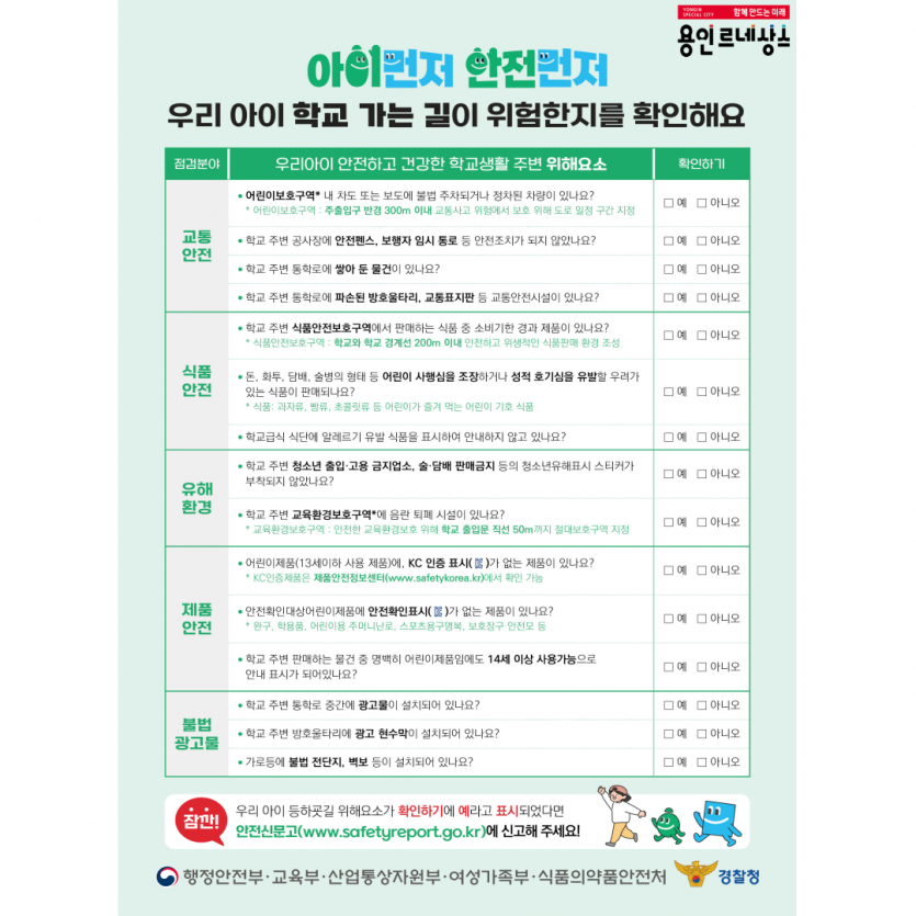 용인특례시, 초등학교 개학 맞춰 위해 요소 집중 점검 - 용인교육지원청 등과 점검반 편성…‘아이먼저’, 어린이가 안전한 학교 환경 만들기 - 김경순 기자 2025-02-28 07:55 가 본문내용 확대/축소 본문 용인특례시, 초등학교 개학 맞춰 위해 요소 집중 점검용인특례시, 초등학교 개학 맞춰 위해 요소 집중 점검 용인특례시(시장 이상일)는 초등학교 개학에 맞춰 어린이의 등하굣길 안전을 강화하고자 3월 말까지 초등학교 주변 보호구역의 안전 점검을 벌인다고 28일 밝혔다. 시는 용인교육지원청, 경찰서, 민간단체 등과 함께 분야별 점검반을 편성해 용인지역 내 105개 초등학교 주변 보호구역을 중심으로 점검할 계획이다. 도로교통법에 따른 어린이보호구역, 교육환경법에 따른 교육환경 보호구역, 어린이식생활법에 따른 식품안전보호구역 등이 대상이다. 점검 분야는 ▲교통안전(통학로 실태, 불법 주·정차 단속, 통학 차량 안전관리) ▲유해환경(교육환경 보호구역 내 불법 영업시설, 유해시설 단속, 청소년 보호 위반) ▲식품 안전(식중독 예방, 식품 위생관리 상태) ▲불법 광고물(노후 광고물ㆍ불법 광고물 정비) 등이다. 점검반은 등ㆍ하교 시간대 위주로 현장 단속과 계도를 하고, 온ㆍ오프라인 매체를 활용해 안전 수칙 안내 등 안전한 학교 환경 만들기 캠페인도 함께 전개한다. 시 관계자는 “개학을 맞아 지역사회가 함께 초등학교 주변 안전을 위협하는 요소를 사전에 점검하는 등 안전한 환경을 만들기 위한 계획을 세웠다”며 “어린이가 안심하고 학교생활을 할 수 있는 사회적 분위기를 만드는 데 최선을 다하겠다”고 말했다. 좋아요 0 싫어요 0 김경순 기자 기자의 다른기사 보기 목록 댓글목록 이전글 용인특례시, 위생등급 지정업소에 청소비 지원 25.02.28 다음글 용인특례시,‘관곡마을 실버케어센터 치매예방 프로그램’참여자 모집 25.02.28