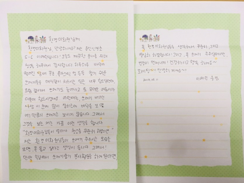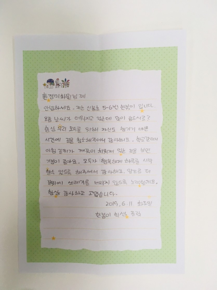 수지구, 신봉초 학생들이 미화원에 손편지 120통 보내 김경순 기자 2019-06-28 05:01 가 본문내용 확대/축소 본문 수지구, 신봉초 학생들이 미화원에 손편지 120통 보내수지구, 신봉초 학생들이 미화원에 손편지 120통 보내수지구, 신봉초 학생들이 미화원에 손편지 120통 보내 용인시 수지구는 신봉초등학교 5학년 학생 120명이 환경미화원에게 직접 쓴 손편지 120통을 보내왔다고 27일 밝혔다. 학생들이 도시 청결을 위해 밤낮으로 애쓰는 환경미화원에게 감사의 인사를 전하기 위해 정성껏 쓴 편지를 수지구 생활민원과 앞으로 보낸 것이다. 편지에는 “더운 날씨에 이웃을 위해 깨끗이 청소해주셔서 감사하다”는 내용과 “앞으로 분리수거도 열심히 하고 길에 함부로 쓰레기를 버리지 않을 것”이라고 다짐하는 내용이 담겨있다. 구는 이 편지를 환경미화원과 관련 업체 임직원에게 전달해 학생들의 진심어린 마음을 대신 전했다. 편지를 받은 한 미화원은 “청소일이 고되지만 학생들의 정성이 가득 담긴 편지를 읽고 나니 큰 위로가 된다”고 말했다. 구 관계자는 “깨끗한 도시미관을 만들기 위해 애쓰는 환경미화원에게 손편지를 보낸 건 매우 기특한 일”이라며 “구에서도 학생들에게 답장을 보내 감사의 뜻을 전했다”고 말했다. 좋아요 0 싫어요 0 김경순 기자 기자의 다른기사 보기 목록 댓글목록 이전글 사랑을 담은 표고버섯, 맛있게 드시고 건강하세요! 19.06.28 다음글 용인시, 작은도서관 활성화 위해 우수사례 벤치마킹 19.06.28