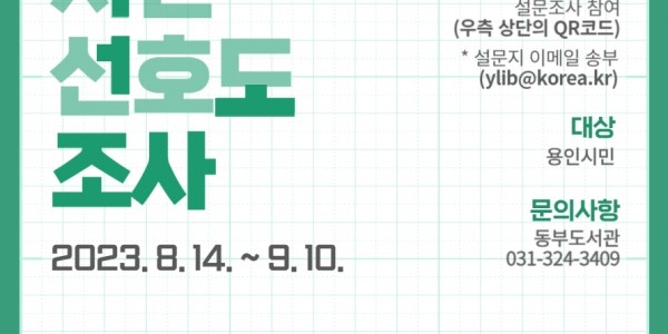 용인특례시(시장 이상일)가 오는 12월 개관 예정인 영덕도서관을 시민이 원하는 장서와 프로그램으로 채우기 위해 14일부터 다음 달 10일까지 선호도 조사를 벌인다. 선호도 조사에서는 ▲도서관에 대한 전반적인 인식 ▲영덕도서관만의 특화 분야 ▲시민이 추천하는 도서 ▲영덕도서관에서 체험하고 싶은 독서문화 프로그램 ▲추천 정기간행물(신문, 잡지 등) 등을 파악한다. 시는 영덕도서관 개관 후 자료실에 ‘시민이 주목한 도서…