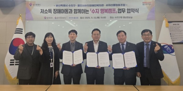 용인특례시(시장 이상일) 수지구는 13일 용인시수지장애인복지관과 수지신용협동조합과 함께 저소득 장애아동의 복지 향상과 장애 인식 개선을 위한 ‘수지 행복캠프’ 추진 업무협약을 체결했다고 14일 밝혔다. ‘수지 행복캠프’는 돌봄 부담으로 어려움을 겪는 장애아동 가정을 지원하기 위해 계절별 주제를 담은 프로그램으로 운영되며, 분기별 20가정이 참여한다. ‘봄맞이 성장캠프’에서…