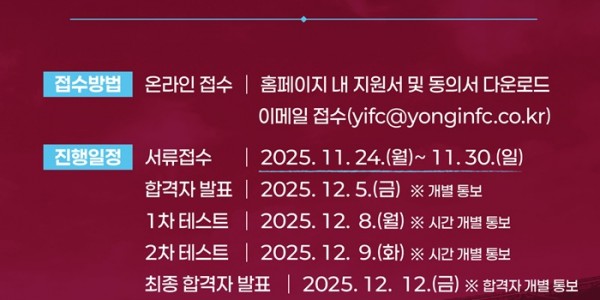 용인FC, 12월 8~9일 공개테스트 진행 – 서류접수 11월 24~30일