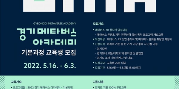 경기도가 메타버스 전문인력 육성을 위한 ‘2022년 경기 메타버스 아카데미’ 기본과정 교육생을 다음 달 3일까지 모집한다.올해 신규 추진되는 아카데미 사업은 메타버스 플랫폼 및 콘텐츠 개발자 양성을 위해 기획, 개발, 디자인, 유통까지 전 부문을 섭렵하는 교육과정으로 운영된다. 올 상반기 3개월간 운영되는 기본과정은 초중급 개발자를 대상으로 하고, 하반기에는 전문개발자를 위한 심화과정이 진행될 예정이다.이번 모집에서는 기본과정…
