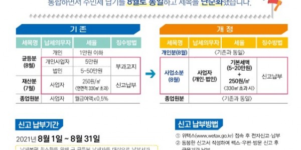 용인시는 26일 사업주가 내는 주민세 ‘재산분’과 ‘균등분’을 ‘사업소분’으로 통합해 8월에 한 번만 내도록 변경한다고 밝혔다. 이는 납세자의 번거로움과 혼란을 줄이기 위해 지방세법이 개정된 데 따른 것이다. 기존에 사업주는 7월에는 신고납부 방식으로 주민세 재산분을 낸 후 8월에는 부과고지 방식으로 주민세 개인사업자·법인 균등분을 납부해야 했다. 이번 개정으로 사업주는 8월 중으로 주민세 사업소분만 신고납부…