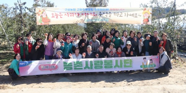 구성농협(조합장 홍종민)은 바쁜 영농철을 맞아 고사리 손이라도 절실한 농촌의 어려움에 구성농협 임·직원들과 고향주부 30여명이 참석한 가운데 11월 10일 강원 홍천 내촌면 사과재배농가(약1,200평)의 사과수확을 도와 부족한 인력을 지원하였다. 이날 실시된 일손돕기에는 구성농협(홍종민조합장)과 내촌농협(사재석조합장)과의 도농교류를 통한 인연이 되어 고향주부 회원들과 수확의 구슬 땀을 흘리…