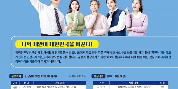 용인시는 다음 달 17일까지 생활 속 불편이나 규제 등을 개선하기 위해 전 시민을 대상으로 ‘민생규제 혁신과제’를 공모한다고 밝혔다. 이번 공모전은 행정안전부에서 추진하는 것으로 공모과제는 국민복지, 일상생활, 취업‧일자리, 소상공인‧중소기업 지원, 신사업 등 총 5개 분야로 국민 생활이나 지역경제 활동 전반을 아우르는 규제가 포함된다. 대한민국 국민이라면 누구나 참여할 수 있으며 일상이나 현장에서 느끼는 규제 등을…