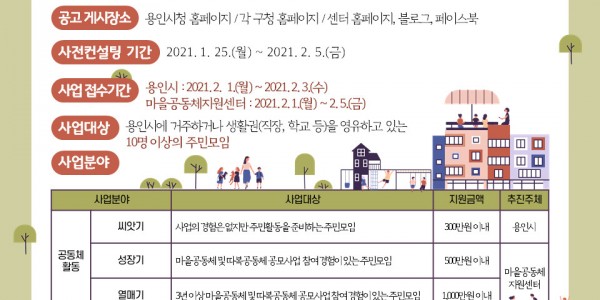용인시가 4억2천만 원 규모의‘2021년 마을공동체 주민제안 공모사업’을 진행한다고 17일 밝혔다. 마을공동체 주민제안 공모사업은 마을공동체를 통해 주민의 자발적 참여를 이끌고, 마을 공통의 문제를 해결하기 위해 시가 지난 2015년부터 매년 진행하고 있는 사업이다. 올해는 도비와 위탁금을 포함해 4억2천여만 원의 예산을 확보했으며, 최대 2천만 원까지 지원한다. 공모사업은 ▲주민 모임을 지원하는 ‘공동체활동…