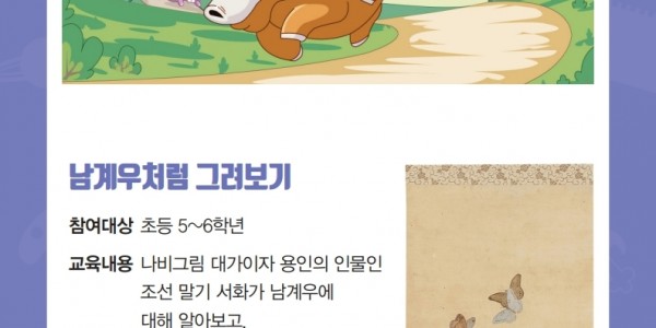 용인시는 18일 용인시박물관서 겨울방학을 맞아 운영하는 비대면 교육프로그램에 참가할 초등 3~6년생 200명을 25일부터 모집한다고 밝혔다. 이번 프로그램은 참여자에게 우편으로 교육 키트를 배송한 뒤 온라인 동영상 강좌를 통해 각 가정에서 체험을 하는 식으로 운영된다. 교육은 열두 띠 동물의 유래에 대해 알아보고 올해의 동물인 소 모양 팬시우드를 제작해보는 와 용인의 인물 남계우의 작품세계를 살펴보고 직접 호접도…