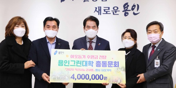 용인시는 1일 용인그린대학 총동문회가 시장실을 방문해 어려운 이웃에게 써달라며 성금 400만원을 기탁했다고 밝혔다. 이날 기탁된 성금은 총동문회가 진행한 ‘2020년 작은나눔 큰사랑’행사에서 직접 생산한 농산물을 판매해 얻은 수익금이다. 원유철 동문회장은 “봉사활동에 참여해 준 회원들께 감사하고, 생활이 어려운 이웃들의 겨울나기에 보탬이 되었으면 좋겠다”라고 했다. 백군기 용인시장은 “동문회에서 지역사회에 대한…