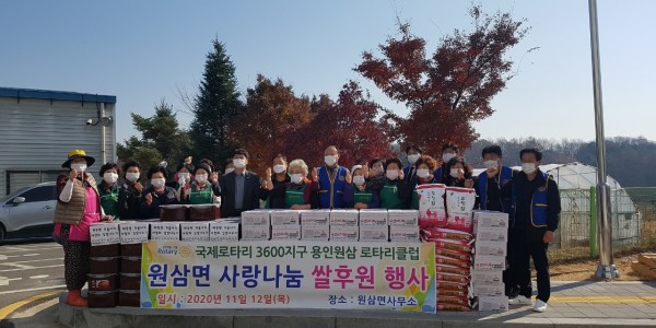 용인시 처인구 원삼면은 12일 용인원삼로타리클럽이 관내 어려운 이웃을 위해 써 달라며 쌀 10kg짜리 20포를 기탁했다고 밝혔다. 이날 기탁한 쌀은 용인원삼로커리클럽 회원들이 직접 콩 농사를 지어 이를 판매한 수익금으로 마련한 것으로 관내 홀로어르신, 장애인 등 저소득층 취약계층 20가구에 전달할 예정이다. 이탁주 용인원삼로타리클럽 회장은 “코로나19로 어려운 이웃들이 더욱 힘든 겨울을 맞이할 것 같아 작은 도움이라…