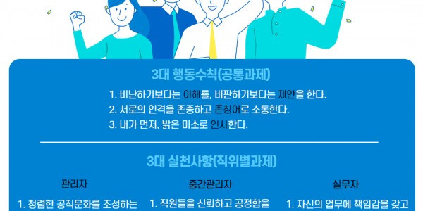 용인교육지원청은 교육현장 속 상호존중문화 정착을 위한 용인교육 3대 행동수칙과 3대 실천사항을 선정했다고 12일 밝혔다. 3대 행동수칙은 공통과제, 3대 실천사항은 직위별과제로 구성원 모두가 6개의 과제를 실천하여 갑질을 예방하고 존중과 배려가있는 학교문화를 조성할 수 있도록 하였다. 3대 행(行)·실(實)을 비롯한 용인교육지원청 반부패·청렴 활동은 공식 인스타그램 및 홈페이지에서 확인할 수 있다. 한편, 용인교육…